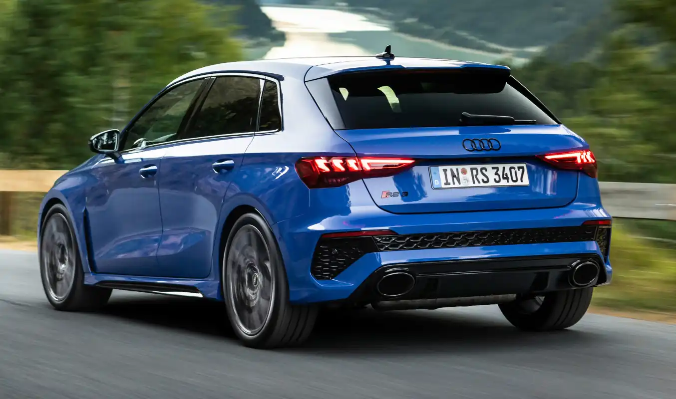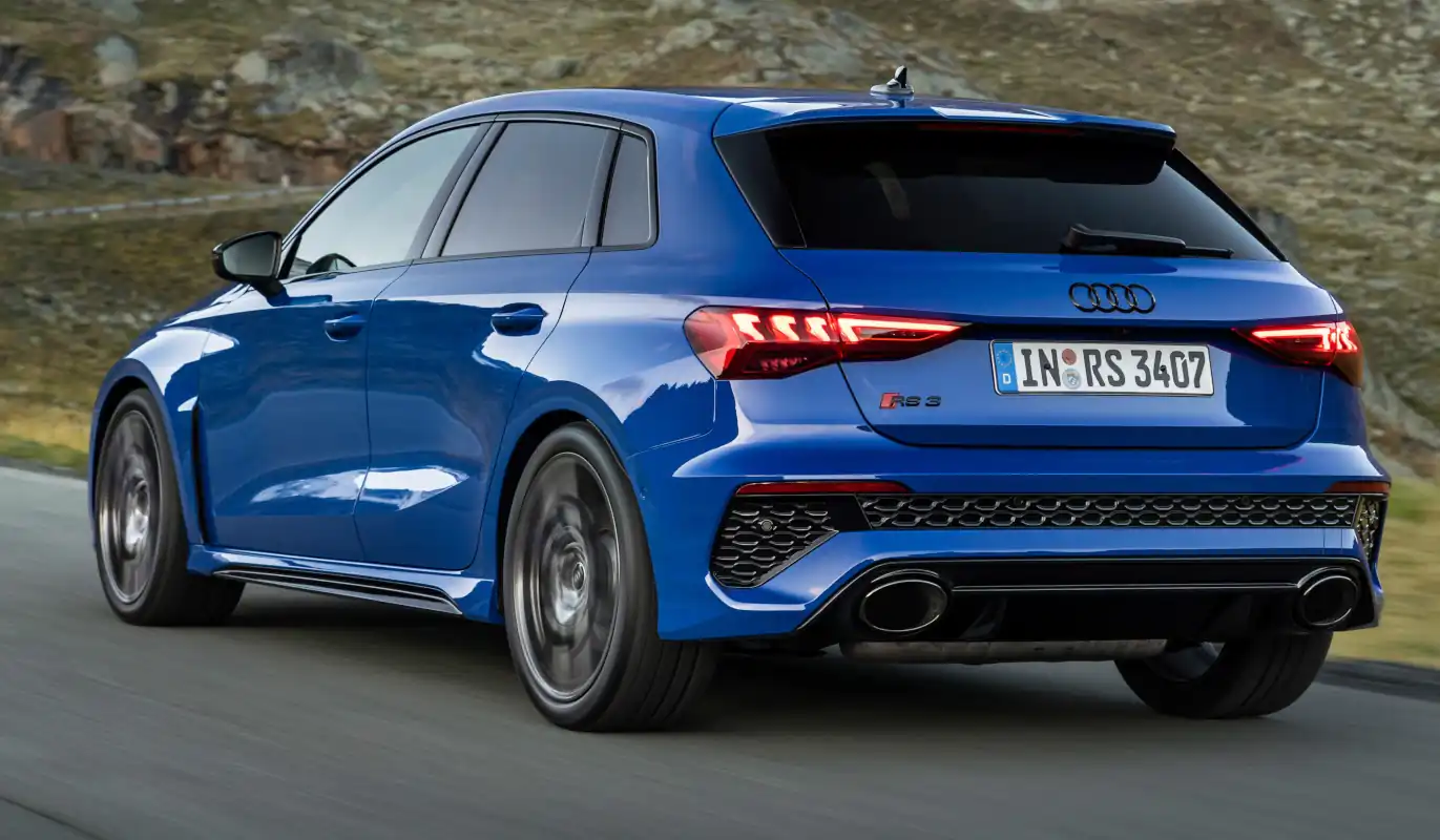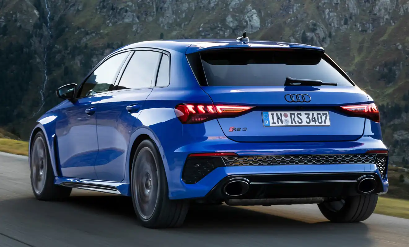 The power is complemented by the unmistakable and emotional sound of the five-cylinder engine with its characteristic 1-2-4-5-3 firing sequence. The standard RS sports exhaust system with a modified center silencer and glossy black, oval tailpipe trims gives a sporty, robust sound to the outside. The fully variable exhaust flap control, which broadens the sound spectrum, has been adapted slightly for the RS3 performance edition: in Audi drive select’s Dynamic, RS Performance, and RS Torque Rear modes, the exhaust flaps open further when the car is stationary, which makes the sound even more present.