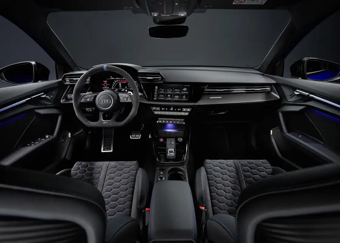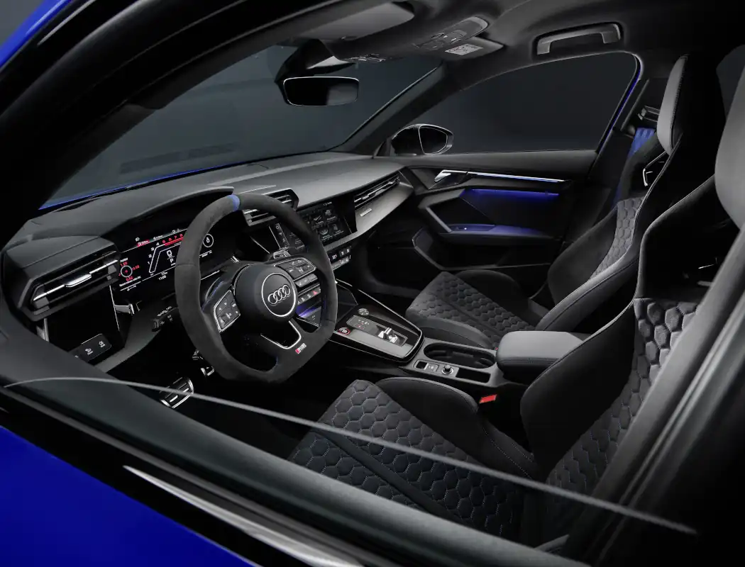 The special model also shows its exclusivity in the interior. For the first time in the RS3, bucket seats are available as standard equipment, ensuring outstanding lateral support during dynamic cornering. Like the outer rear seats, the seat center panel also has contrasting blue honeycomb stitching. The material used for this is Dinamica microfiber fabric, which is combined with pearl Nappa leather on the side bolsters. Below the headrest, the black funnel aperture incorporates large RS lettering and, like the Carbon matte back of the seat back, emphasizes the sporty character of the special model. In addition to the full-surface blue belt straps, the contrast stitching on the center armrest, the door armrests, and the steering wheel are also in blue. The same applies to the floor mats and the trunk mat in black Velour, which also features RS lettering. For better orientation during sporty driving, the Alcantara steering wheel, which is flattened at the bottom, features a 12 o’clock marking – also in blue.