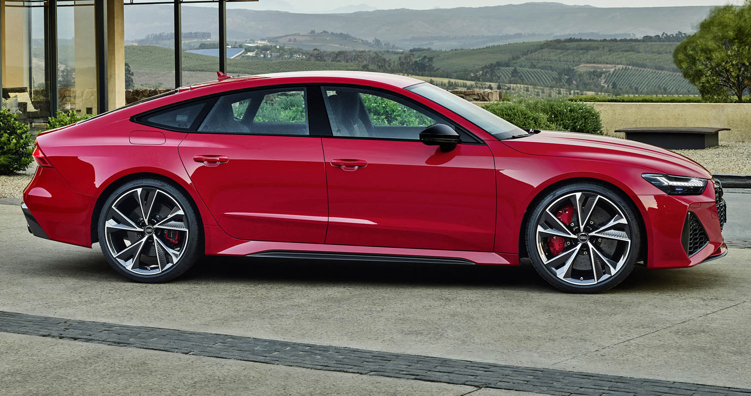 The new Audi RS7 Sportback sits low to the ground. The flared wheel arches emphasize the spectacularly sporty nature of the high-performance model. The noticeable is no optical illusion-at 1,950 millimeters (76.8 in) at the front fenders, the tape measure has to stretch an extra 20 millimeters (0.8 in) on each side over the Audi A7 Sportback.