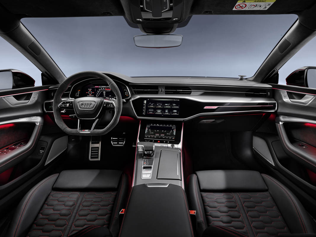 Much like the exterior design of the new Audi RS7 Sportback, the design language in the interior combines taut, sinewy surfaces with clearly defined contours. A stripped-down look with sporty accents are the key stylistic elements in the interior. All the design motifs are logically connected. There is plenty of space for the driver and passenger, with the architecture of the interior accomplishing a seamless transition to the futuristic user interface. From the Audi A7 Sportback, the Audi RS7 Sportback takes on the fully digital operating concept called the MMI touch response, which can be operated intuitively like a smartphone with touch and swipe gestures: two touch displays with haptic and acoustic feedback replace the rotary push-button and many buttons from the previous model.