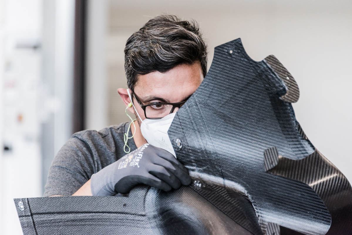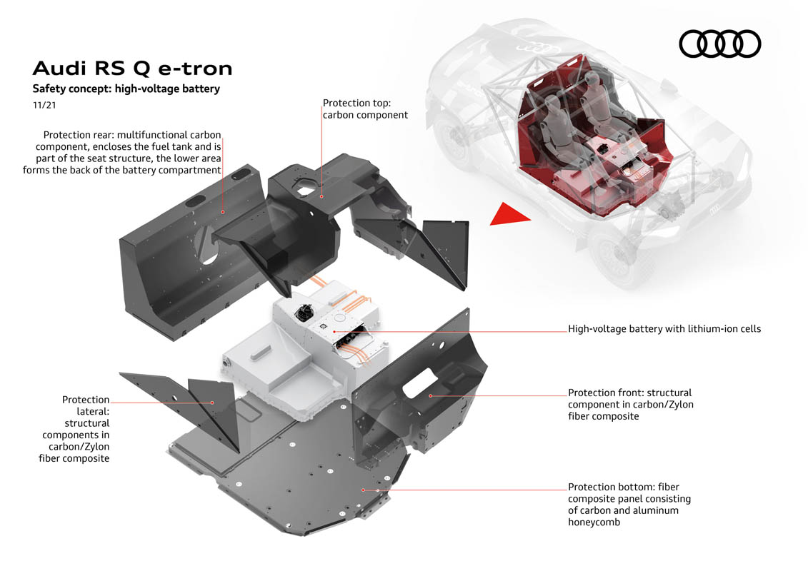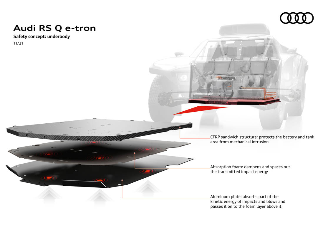 The high-voltage system of the electric drive with its energy converter requires multiple protection. The encapsulation of the centrally located and thus particularly safe high-voltage battery comprises CFRP structures, some of which are reinforced by Zylon. The protection at the bottom is very complex. In off-road sports, the underbody is the assembly subjected to extreme stresses, including meter-high jumps, whirled-up stones and large ramp angles. Its lowest layer consists of an aluminum plate. It resists abrasion by hard objects and partially absorbs impact energy. The energy-absorbing foam above absorbs the impacts and distributes them to the sandwich structure above. This third structure protects the high-voltage battery and the gasoline tank of the energy converter. The CFRP sandwich structure performs two main tasks: The absorption of the surface load, which is passed on from the aluminum plate via the foam, and the dissipation of energy by crushing when the surface load is exceeded. This controlled collapse thus protects the battery above. In the event of excessive damage, the assembly can be easily replaced during the evening service in the rally bivouac.