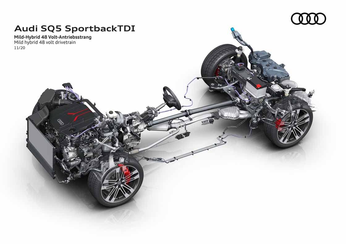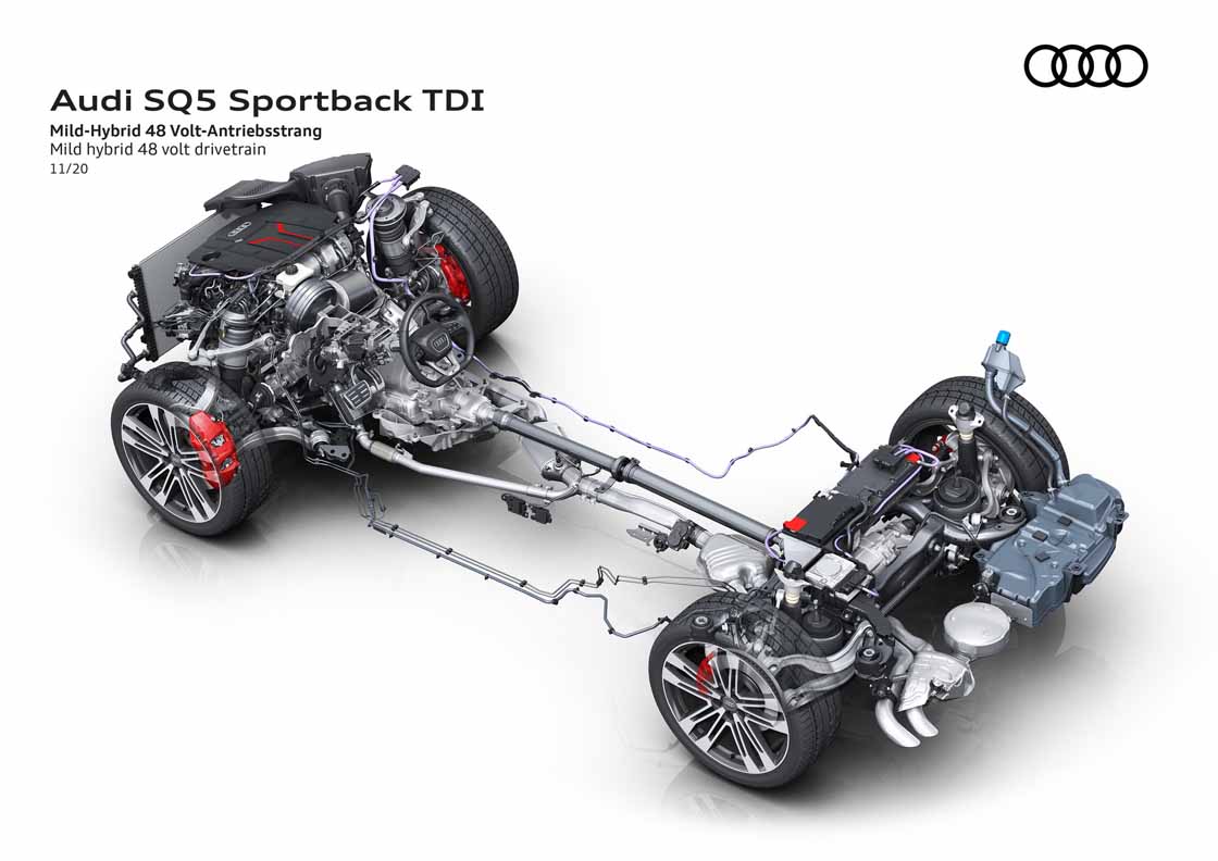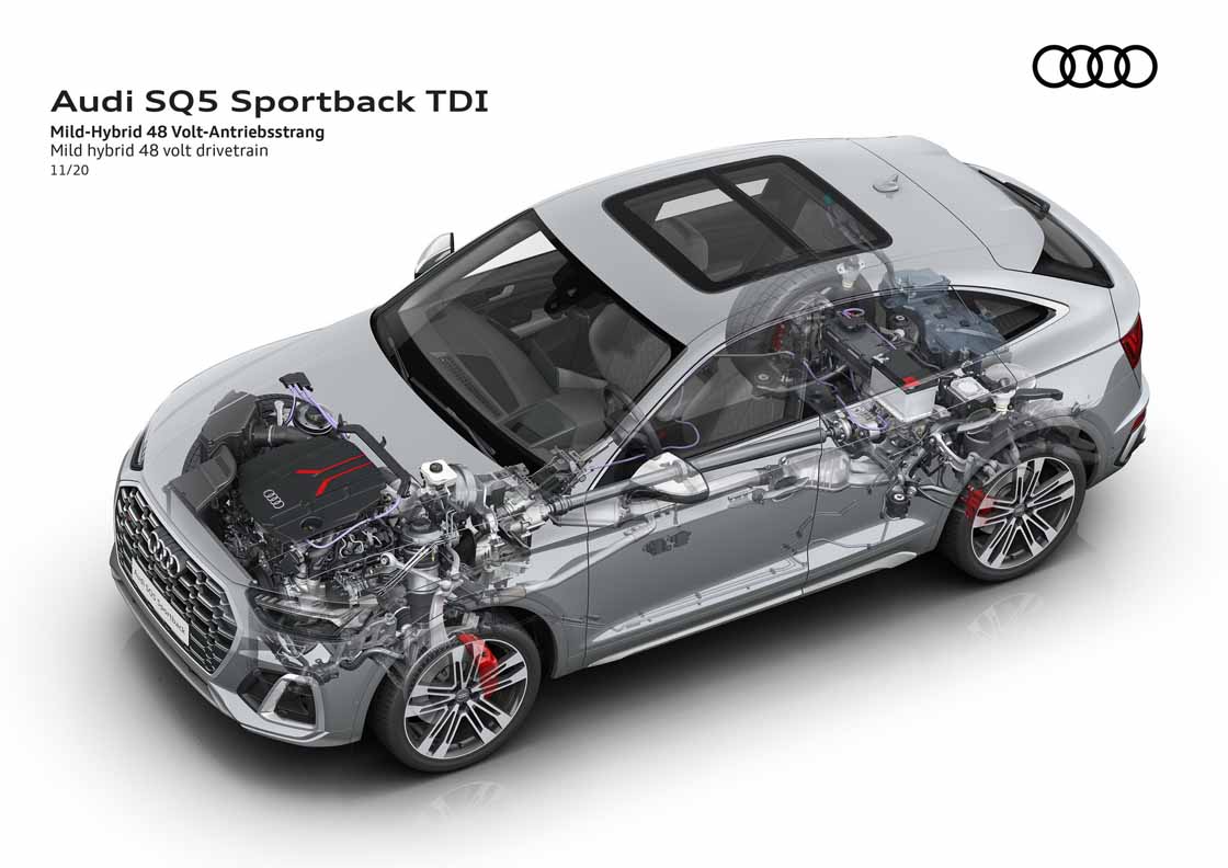 The Audi Q5 Sportback 50 TDI quattro offers even more power and torque (combined fuel consumption in l/100 km (US mpg): 6.9–6.7 (34.1 –35.1); combined CO2 emissions in g/km (g/mi): 182–176 (292.9 –283.2)): This model offers 210 kW (286 PS) and 620 Nm (457.3 lbft) – enough for a standard sprint in 5.7 seconds and maximum speed of 240 km/h (149.1 mph). The MHEV system works here with 48 V and is even more effective than it is in the four-cylinder diesel. The eight-speed tiptronic goes through the gears smoothly and swiftly; the quattro permanent all-wheel drive uses a mechanical center differential. It distributes 40 percent of the torque to the front axle and 60 percent to the rear and, when necessary, directs the majority of it to the axle with better traction.