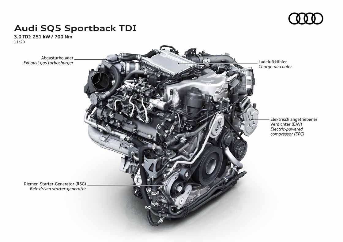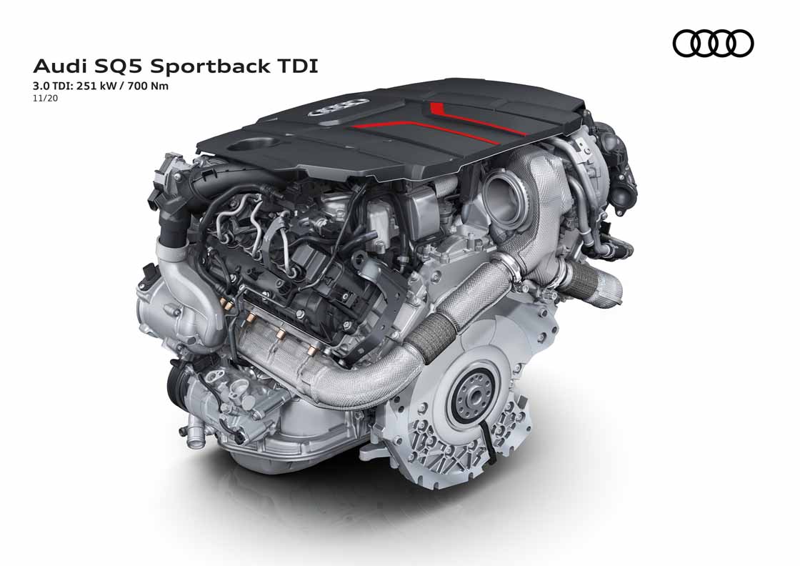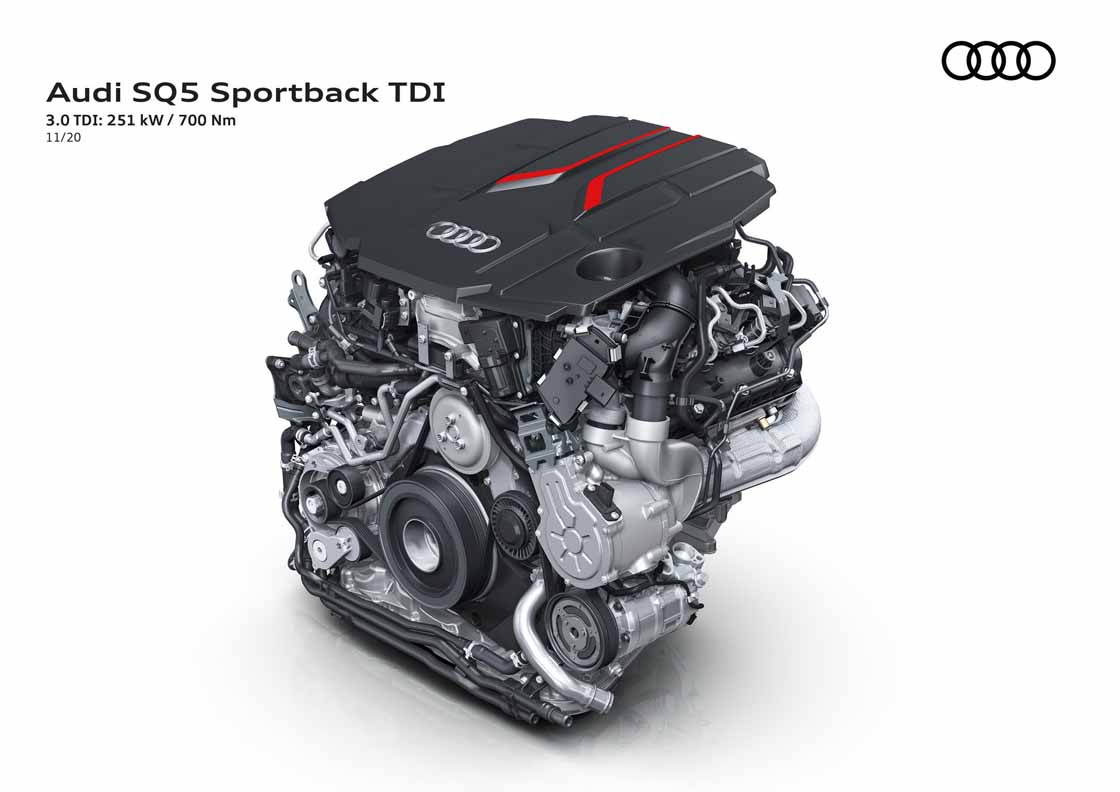 At the forefront of the range is the Audi SQ5 Sportback TDI (combined fuel consumption in l/100 km (US mpg): 7.1–7.0 (33.1–33.6); combined CO2 emissions in g/km (g/mi): 186–185 (299.3–297.7)). Its cultivated three-liter diesel engine produces an output of 251 kW (341 PS), the powerful torque of 700 Nm (516.3 lb-ft) is constantly available from 1,750 rpm to 3,250 rpm. An actuator in the exhaust system lends the sound tone and richness. Performance: 0 to 100 km/h (62.1 mph) in 5.1 seconds, top speed of 250 km/h (155.3 mph) (electronically limited).