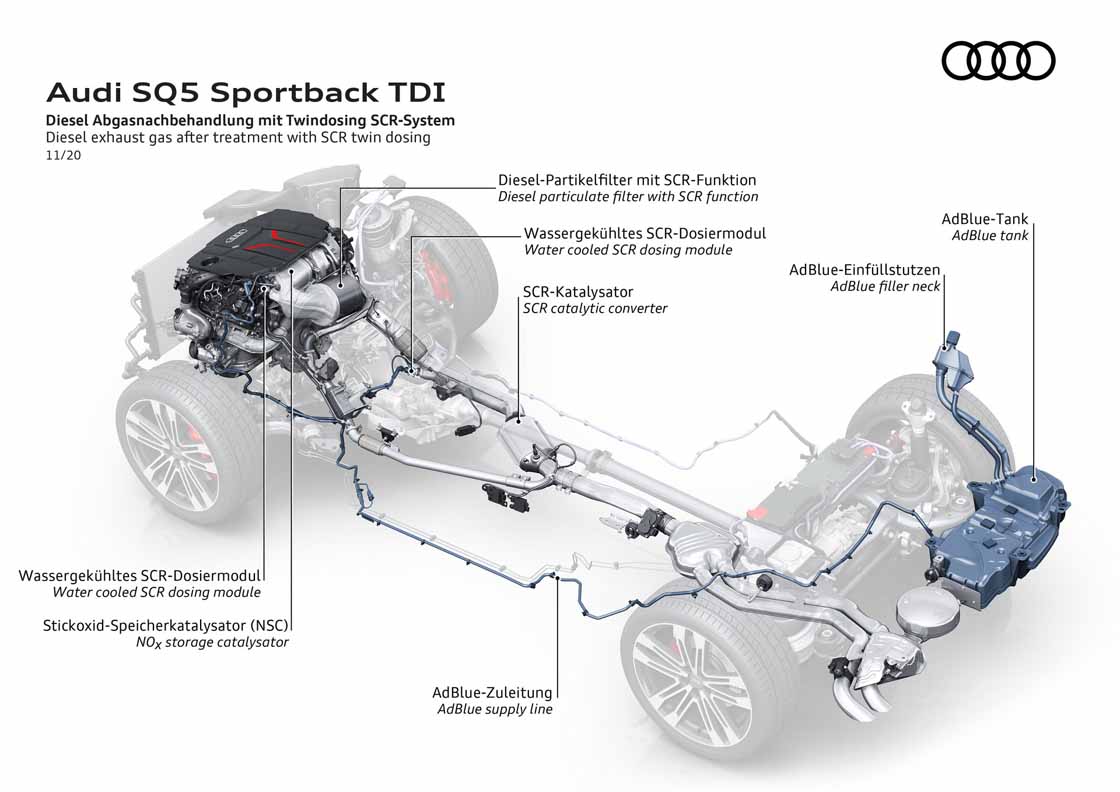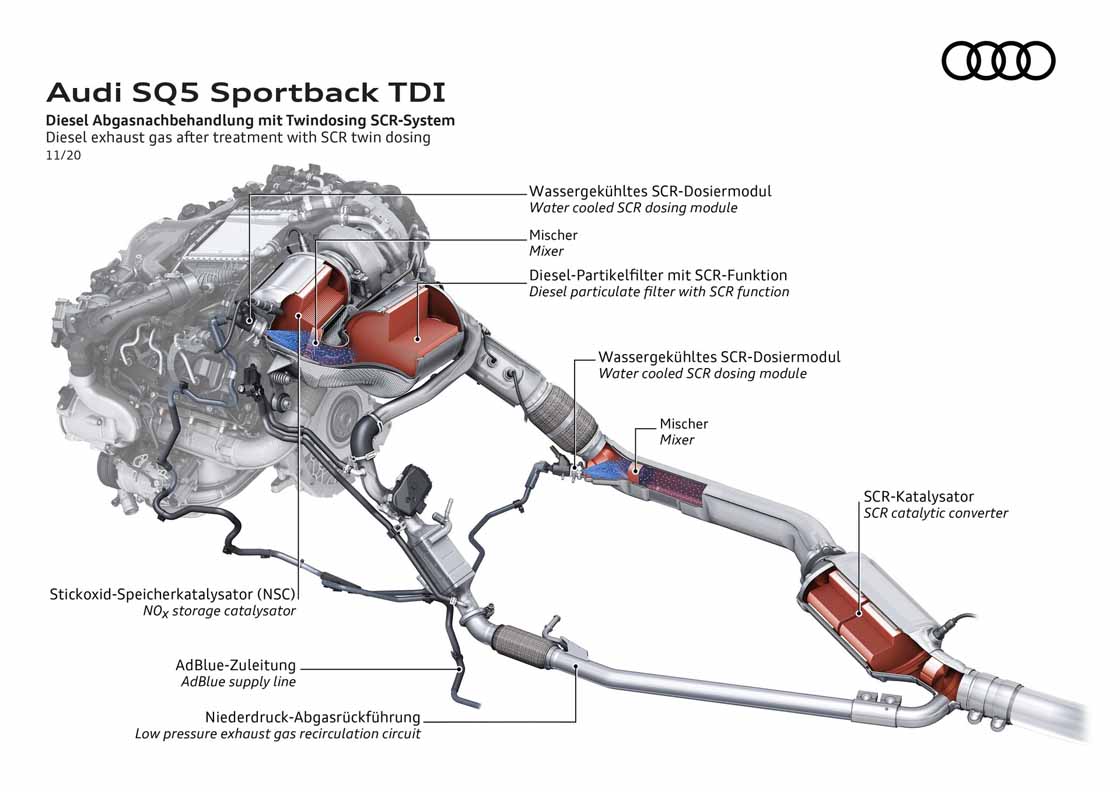 As in all TDI engines, Audi employs the twin dosing technology with two SCR catalytic converters in the Q5 Sportback for the aftertreatment of the exhaust gas. The first of these catalytic converters lies directly behind the manifold in the exhaust line and serves as a particulate filter at the same time; the second is located away from the engine under the vehicle floor.