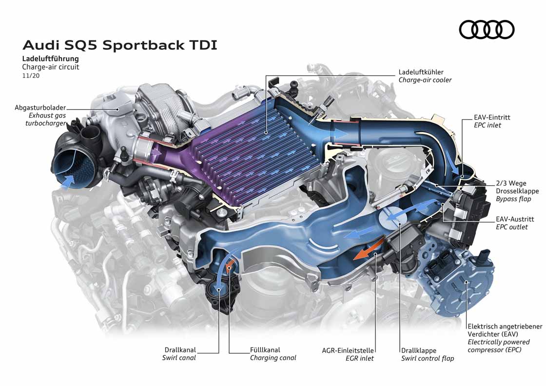 Another building block in the 48 V network is the electric powered compressor (EPC). When moving off and accelerating from low rotational speeds, it accelerates the build-up of the boost pressure and ensures that the 3.0 TDI responds spontaneously.