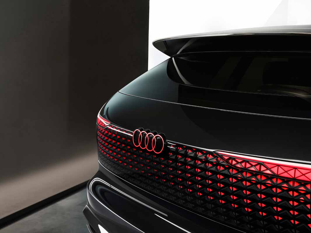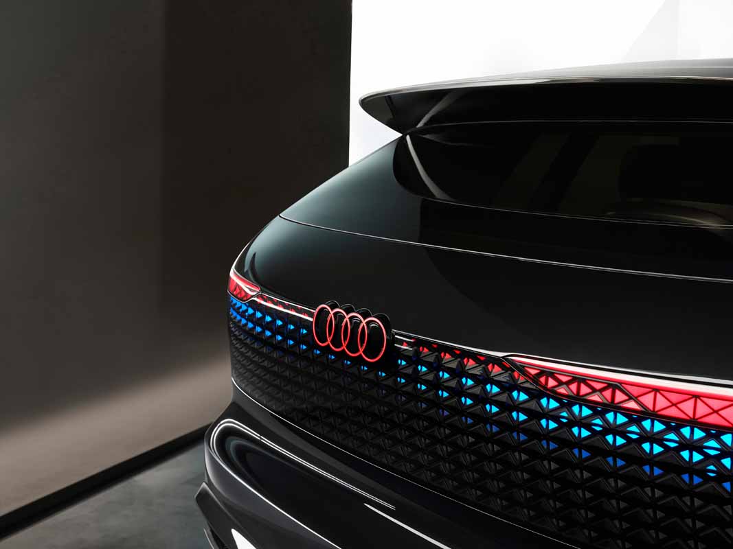 The entire surface of the Singleframe becomes a stage or canvas (known as the “Audi Light Canvas”) and can be used for communication – with dynamic lighting effects to clearly signal to other road users in order to improve road safety. Low beams and high beams are implemented via light segments in the outer sections of the Singleframe and a similarly functioning matrix LED surface is located in the rear.