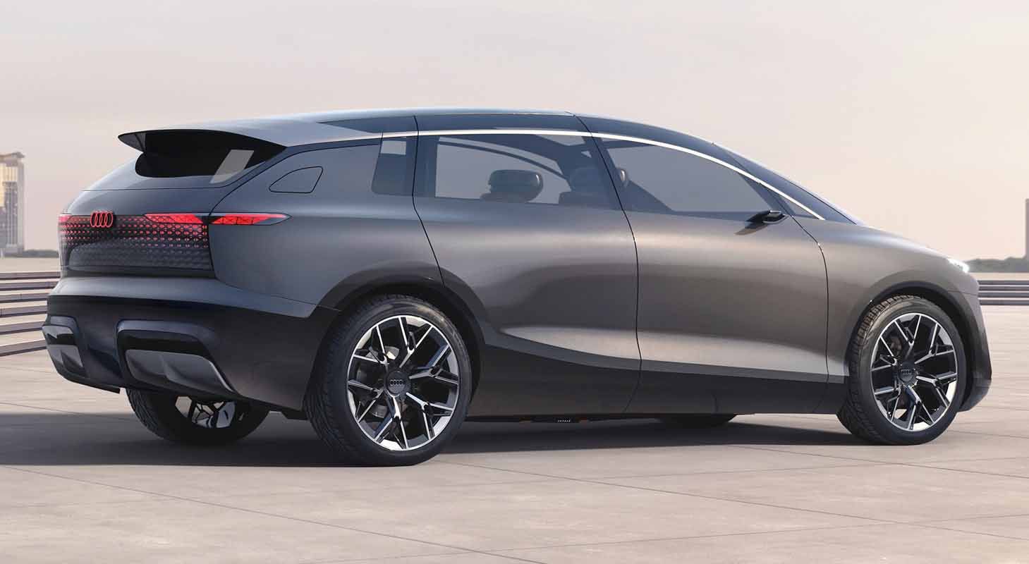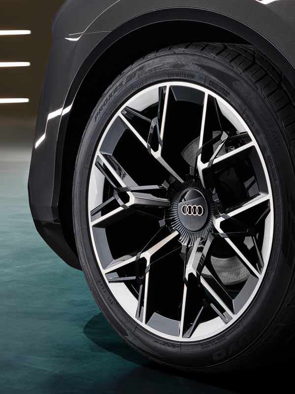 The flowing silhouette of the vehicle body features traditional Audi shapes and elements, which are combined here to create a new composition featuring the distinctive Singleframe, with the digital eyes of the adjacent lighting units, a widely curved, dynamic roof arch, a massive rocker panel that conceals the battery unit, large 24-inch six double spoke wheels (a reference to the iconic 90’s Audi Avus concept car) which convey lightweight design and stability, reminiscent of functional motorsport wheels and the Bauhaus tradition of the brand’s design.