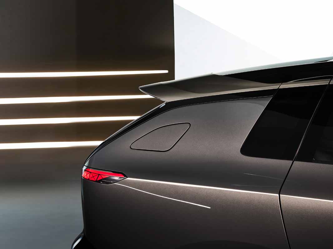 The implied wedge shape of the vehicle body is emphasized by the large, flat windshield. At the front and also at the rear, there are large digital lighting surfaces that leave their mark on the design and at the same time serve as communication elements.