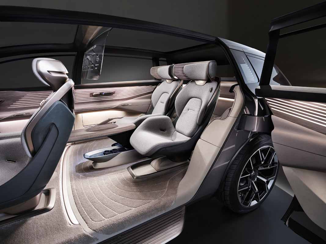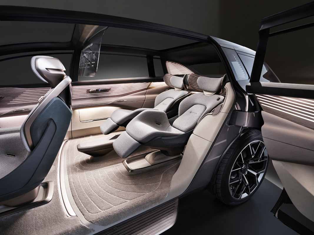 The doors of the Audi urbansphere concept are counter-hinged at the front and the rear; there is no B-pillar. As a result, the whole world of urbansphere interior opens up to passengers as soon as they climb in. Seats that swivel outward and a red carpet of light projected onto the ground next to the vehicle transform the very act of entering the car into an experience of comfort.
