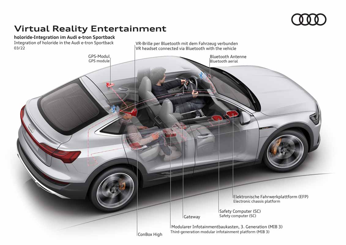 Audi is the first automobile manufacturer in the world to bring virtual-reality entertainment from holoride into series production. Beginning this summer, back seat passengers can put on virtual reality glasses (VR glasses) and immerse themselves in various media formats such as games, films and interactive content. The main attraction: The virtual content adapts to the driving movements of the car in real time. From June 2022, Audi models with the latest upgrade of the modular infotainment toolkit (MIB 3) will be holoride-capable. The new technology will be introduced at the South by Southwest® (SXSW) festival in the United States. Visitors there will be able to experience holoride in a moving vehicle.