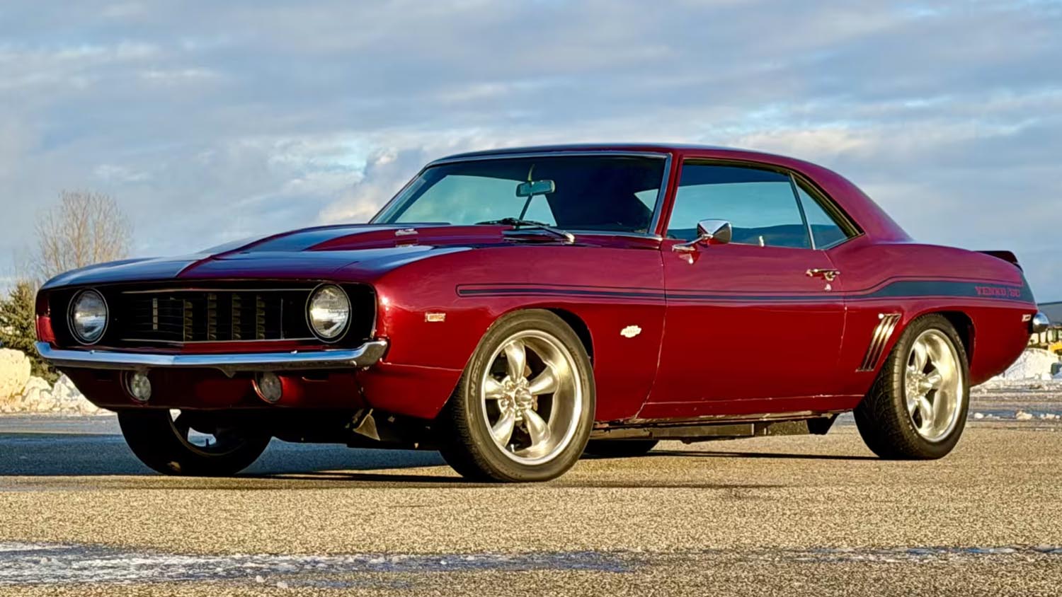 A striking 1969 Chevrolet Camaro 427 CI Yenko replica, finished in Crimson Red Metallic with a Black Houndstooth interior and automatic transmission.