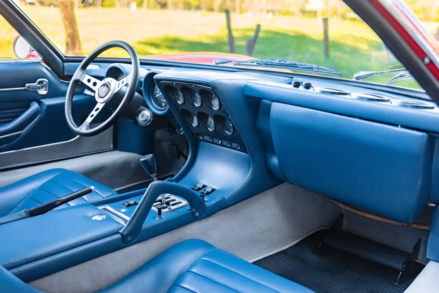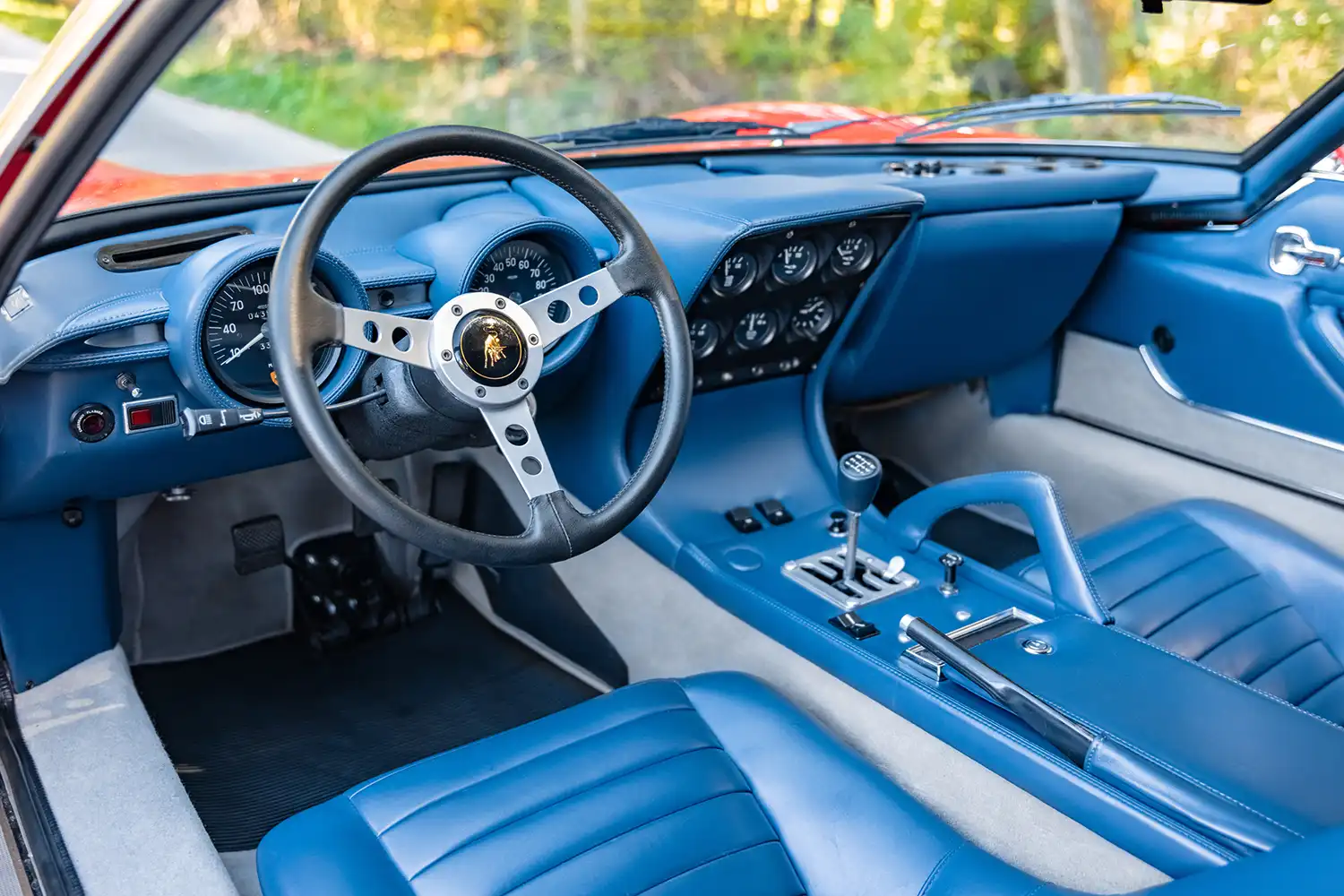 Interior: The interior of this Miura P400 SV is equally impressive, having been reupholstered in its original Bleu (Blue) Connolly leather by Spinneybeck of New York, using a swatch of original material to maintain authenticity. The cockpit is driver-focused, with comfortable bucket seats, a purposeful dashboard layout, and a gated shifter for the five-speed manual transmission. The lightweight carbon fiber trim (if originally fitted or part of the refresh) would add a touch of sporting elegance. The presence of factory air conditioning, a desirable and relatively rare option, enhances the comfort and usability of this supercar. The meticulous attention to detail during the interior refresh ensures that it presents in a condition befitting a Concorso Italiano award winner.