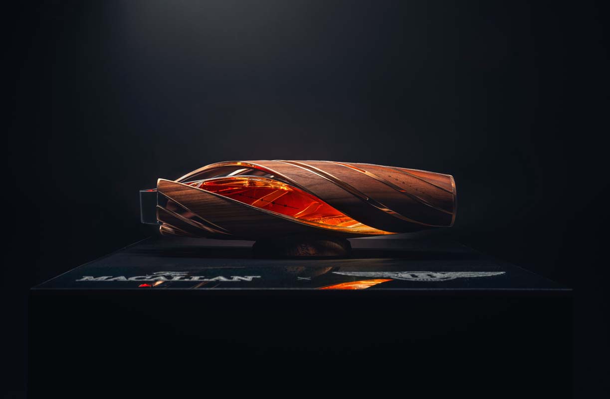 At the centre of the design is a hand-made glass bottle with an extraordinary 180-degree twist, representing the mastery of space and time achieved by The Macallan and Bentley Motors in creating the prototype.