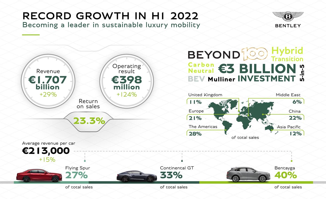 Turnover increased from €1.324 billion during the first half of 2021 to €1.707 billion, while revenue per car climbed from €186,000, to €213,000, largely due to increased levels of personalisation. No luxury brand now sells more cars over €200,000 or €250,000 than Bentley. Return on sales also reached a record 23.3 per cent during the first six months of 2022, up from 13.4 per cent the previous year.