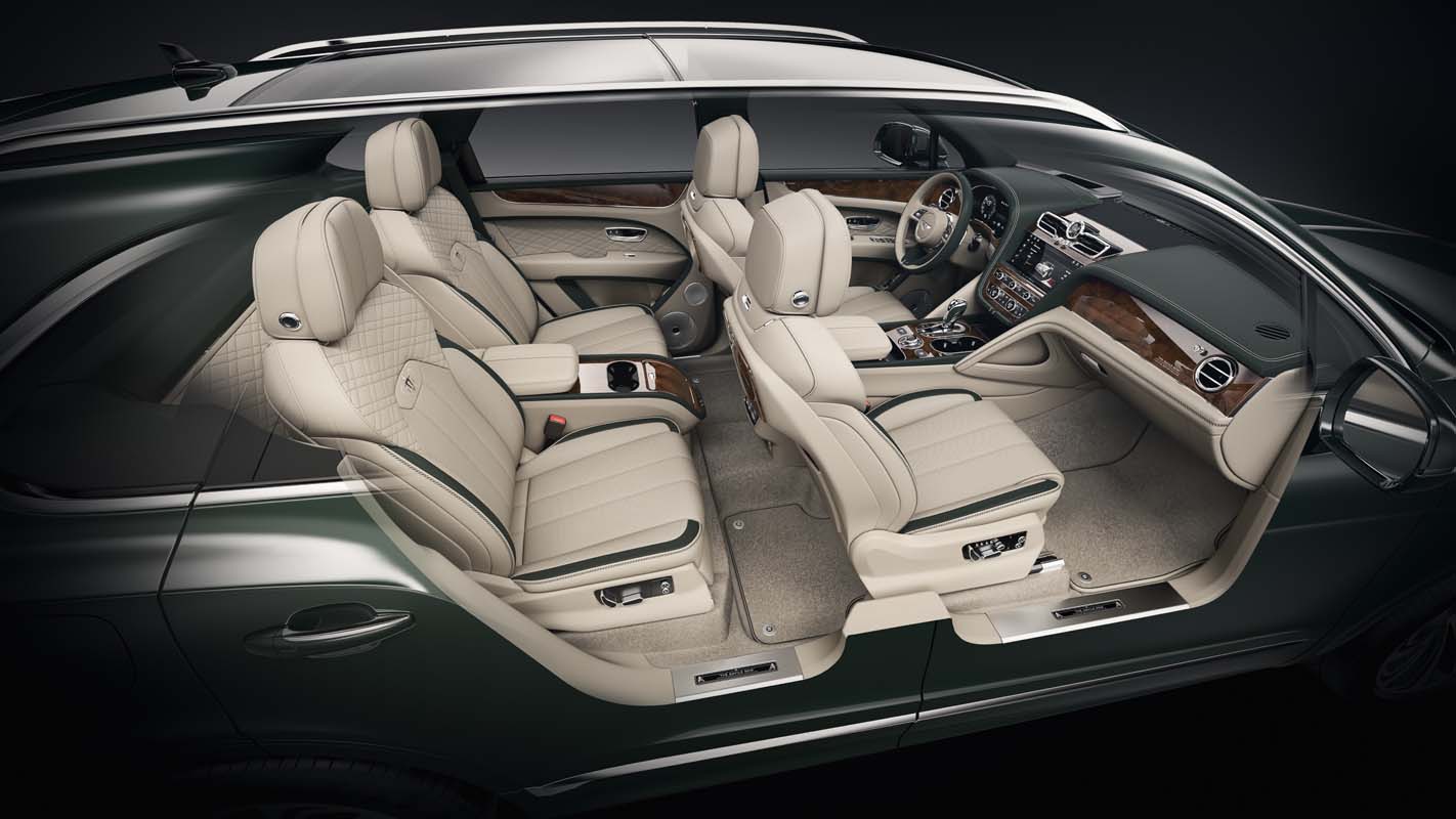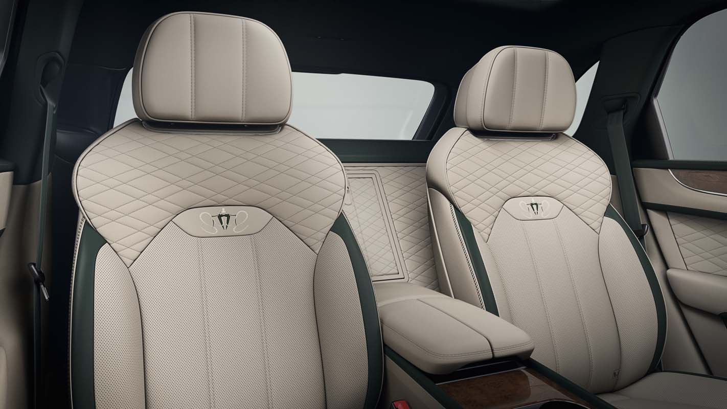 Clean Cumbrian Green bodywork is twinned with 22” ten-spoke wheels, Cumbrian Green-painted and with a bright machined finish. Inside, the four seat cabin with rear centre console uses a beautiful bespoke colour split in Cumbrian Green and Portland hides, with carefully selected areas of contrast stitching. Mulliner’s ‘Serenity’ seat quilting to the seats, doors and backboard is complemented by bespoke and exclusive High Gloss Burr Elm veneer on the fascias, centre consoles and door waistrails – the first time this veneer has been used in a modern Bentley.