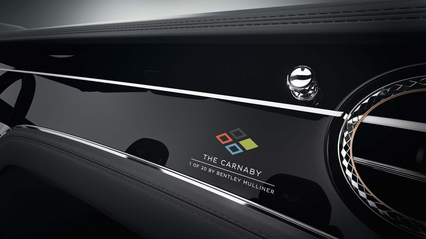 The Convertible model in the collection is The Carnaby, based on Carnaby Street in London’s Soho district. Known for its energetic and lively atmosphere and bright colours, Carnaby Street has inspired an equally vibrant Bentley available in four different colours – Radium, Jetstream II, Orange Flame and Onyx. 22” wheels are black-painted and then finished with a solid white (Arctica) accent, which is matched by an Arctica pinstripe to the Styling Specification body kit. The Carnaby badging is fitted to the front wings.