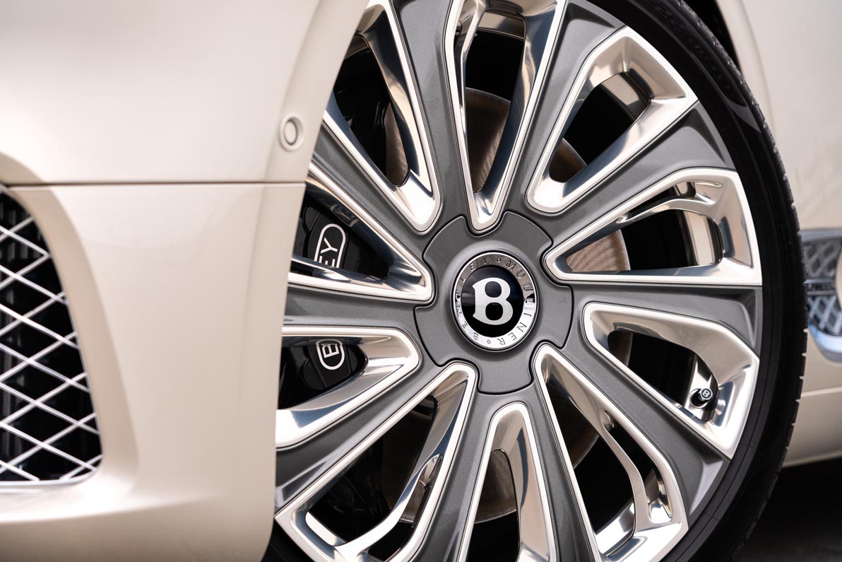 The car sits on new and unique 22″ Mulliner wheels, with a bespoke design of elegant beauty in a painted and polished finish. The centre badge of each wheel is self-levelling, keeping the iconic Bentley ‘B’ upright at all times.
