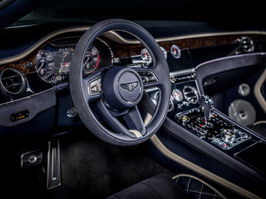 Inside a luxuriously-appointed cabin, the new Continental GT Convertible model includes Speed badging on the passenger fascia, an Alcantara steering wheel and a unique colour split trim in hide and Alcantara.
