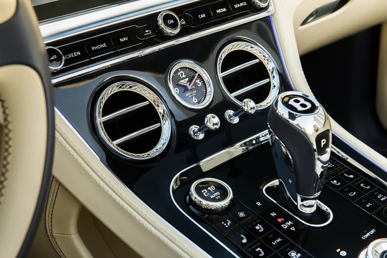 At the heart of both the GT V8 and GT V8 Convertible dashboards are an advanced, fully digital, driver-focussed instrument panel and the optional Bentley Rotating Display. The latter features a 12.3-inch touchscreen housed in a three-sided unit, which revolves the veneer to reveal the touchscreen, as well as three elegant analogue dials.