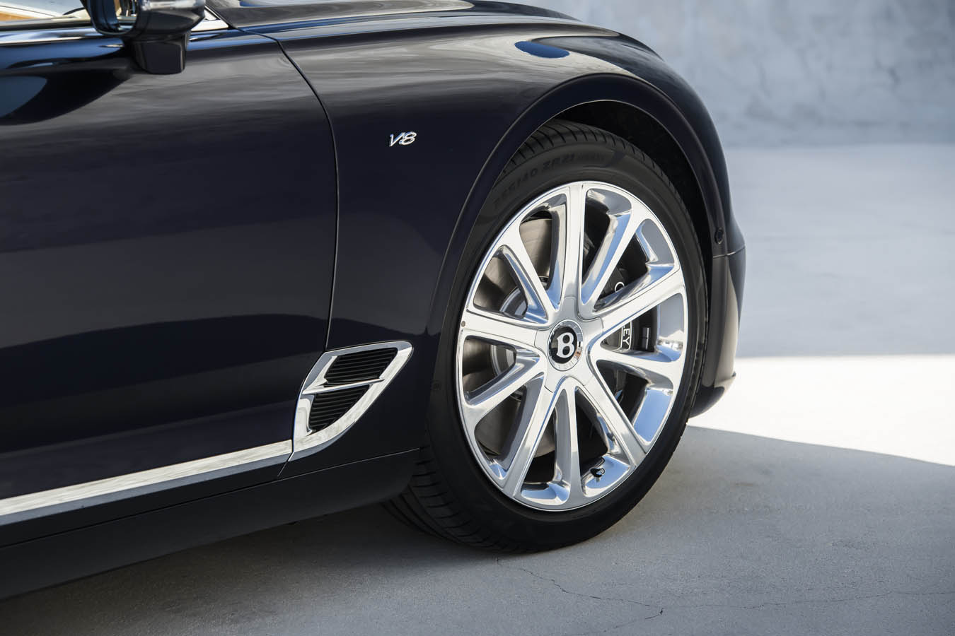 The new V8 models feature 20-inch, 10-spoke painted alloy wheels and the option to choose from nine other designs measuring up to 22-inches. Bentley offers seven standard exterior bodywork colours, with an extensive palate of additional paint choices available. Both GT V8 and GT V8 Convertible are distinguished by quad exhaust pipes and subtle V8 badging to the front wings.
