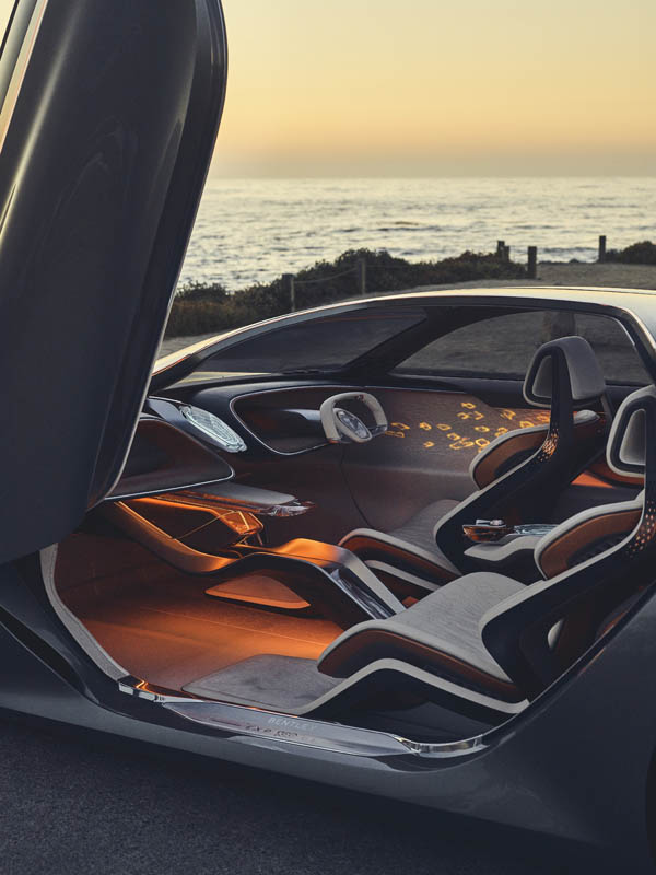 Light is core to life and in the Bentley EXP 100 GT it is harvested from the surrounding environment via an innovative glass roof embedded with prisms that collect light and transfer it into the cabin using fibre optics. The use of harvested natural light and synthesised light offers a new approach to enhancing wellness on board.