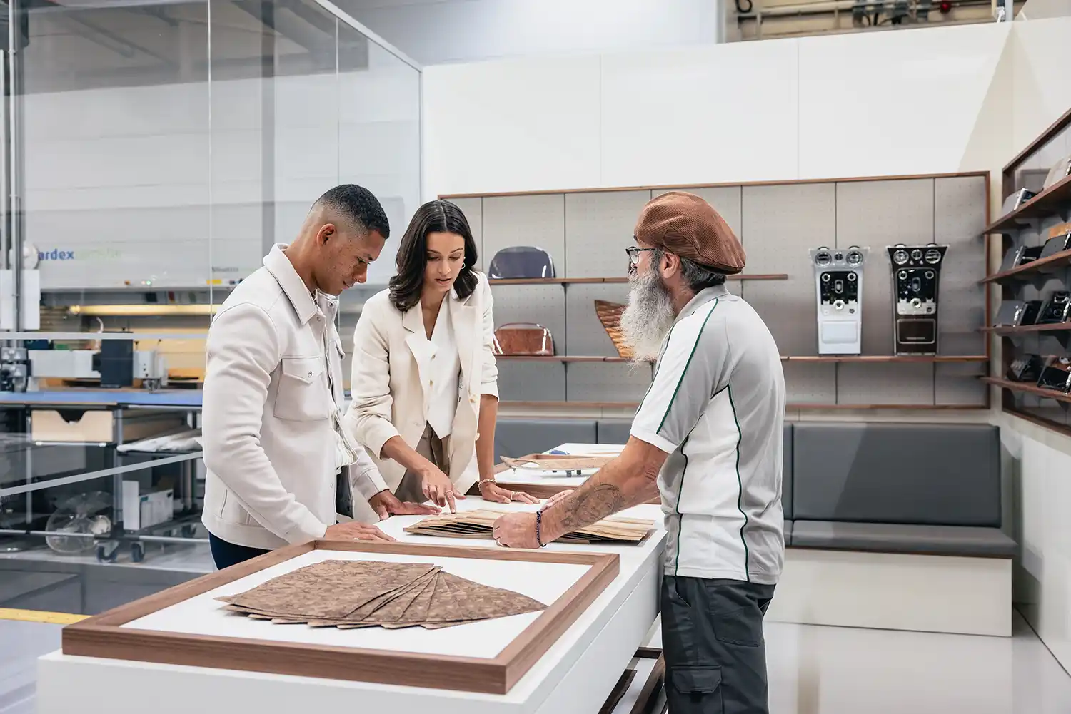 The dedicated wood shop with more than nine sustainable wood finishes from around the world will enable customers to select their own veneers and learn how their car will be precision book and mirror matched. Bespoke finishes such as stone, carbon fibre and machine turned aluminium are also offered.