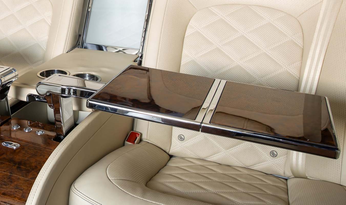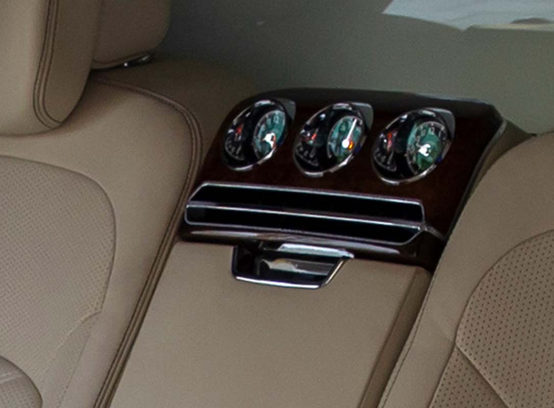 Emphasising the truly luxurious travelling experience, a bottle cooler with crystal flutes sits between the front facing seats, with a beverage cabinet with bespoke crystal tumblers between the rear facing seats. Veneered, folding picnic tables allow the occupants to work comfortably on the move, with iPad docking and charging stations. Bentley craftsmanship is further evidenced by the three handmade dials, which display UK and local time, alongside the exterior temperature.