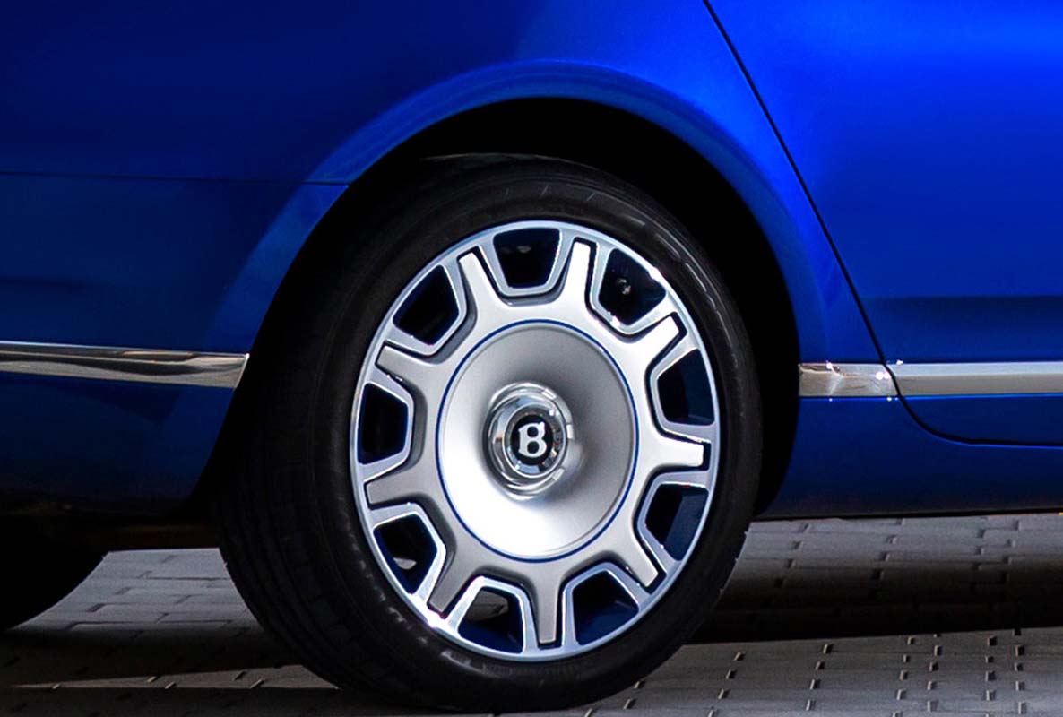 The stretched model sits on a chassis and suspension that were specially re-engineered by Bentley. Power is provided by Bentley’s iconic 6¾-litre twin turbo V8 engine, with 505 bhp (512 PS) and 1,020 Nm (752 lb.ft) of torque. Unique 21” wheels have been treated to match the car’s exterior paintwork, while even its stainless steel Flying ‘B’ bonnet mascot is a bespoke commission: its plinth is engraved with the words: ‘Coachbuilt by Mulliner’.