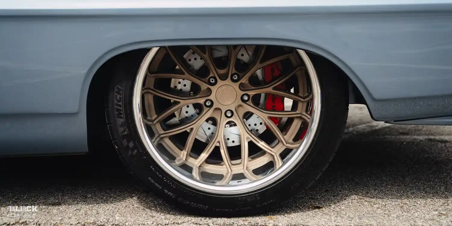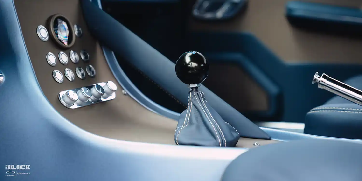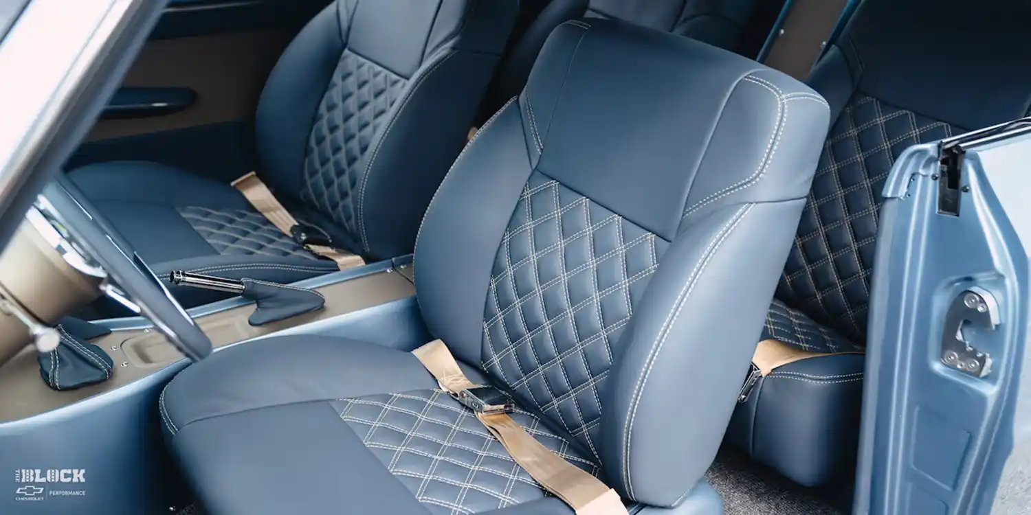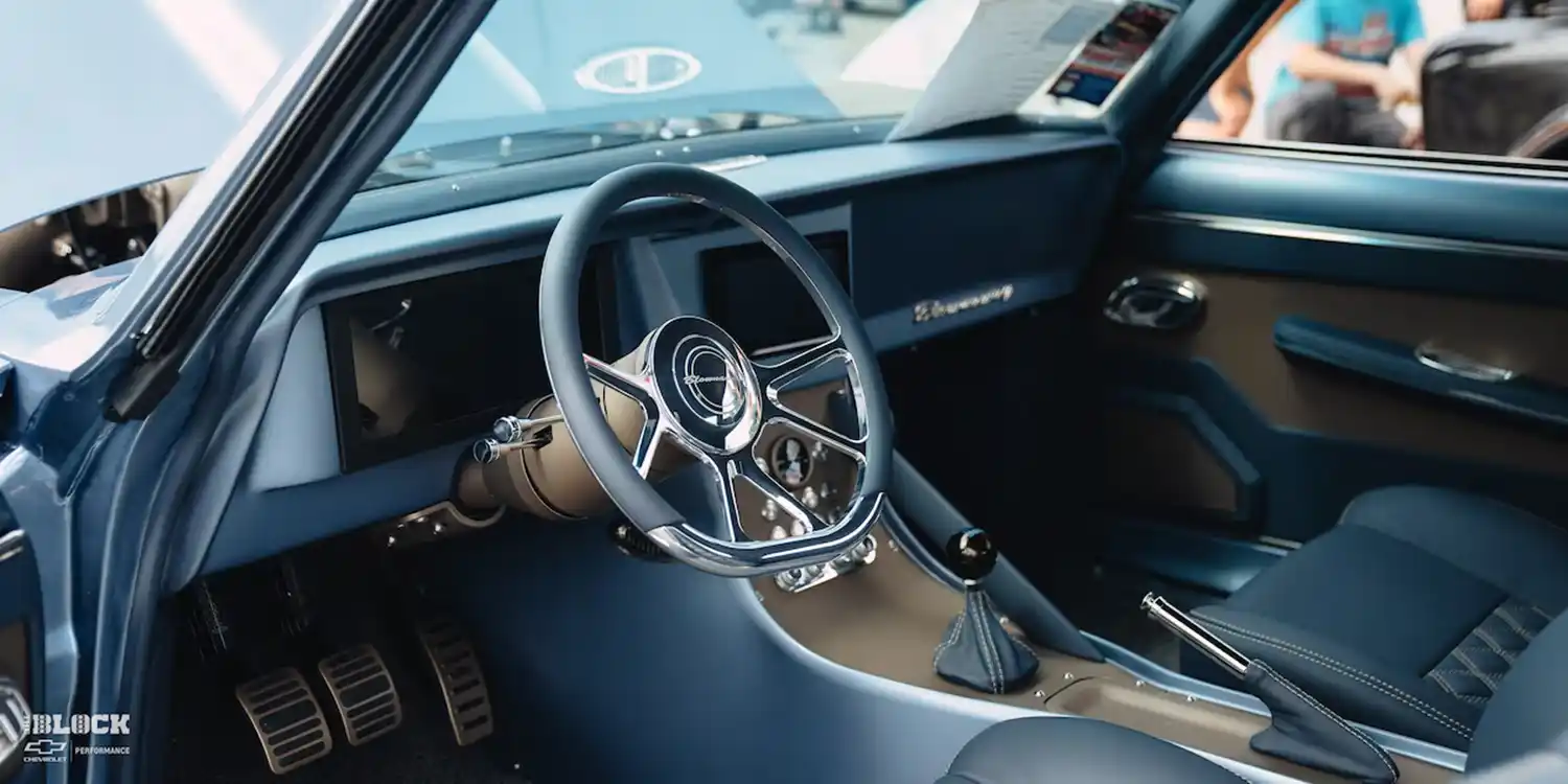 The interior, crafted by JJ’s Upholstery in Denver, continues the bronze and blue theme. The leather seats feature a striking bronze square-checker pattern that echoes design elements on the exterior. The cabin also boasts a unique, one-off dashboard and a custom console inspired by the C8 Corvette, further modernizing the classic Nova.