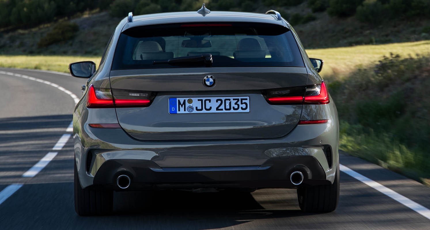 Another feature of the new BMW design language is the flowing transition from the flanks of the car into the rear end. An additional model-specific character line running from the rear door handles into the rear lights and extending along the tailgate’s handle strip, together with the pronounced tapering of the passenger cell above the rear wheel arches, underlines the modern effect of these sculptured surfaces. The rear of the BMW 3-Series Touring emulates its Sedan sibling with an eye-catching spoiler lip which, like the slender rear lights, extends well into the flanks of the car. The rear window is around 20 millimetres wider than on the outgoing model and now extends beyond the water run-off strips on either side of the boot opening. The prominent roof spoiler, further horizontal lines and the L-shaped taillights of the stylishly darkened light units give the rear of the car a wide and dynamic stance. All of the light functions use LEDs as standard. On standard-specification cars, plus Sport Line and Luxury Line models, the T-shaped apertures in the rear apron – which frame the reflectors – mimic elements of the front-end design. Elsewhere, the tailpipes from the exhaust system (a dual-pipe affair on all model variants) have a diameter of 80 or 90 millimetres, depending on the engine fitted, and enrich the car’s undeniably sporty appearance. The new BMW 3-Series Touring also comes as standard with a load sill cover in stainless steel.