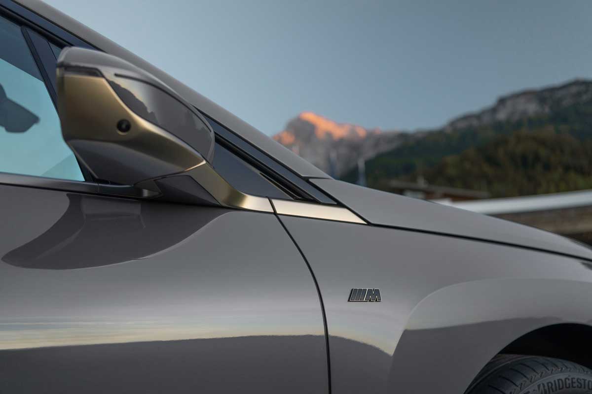 The powerful proportions of a modern SAV, reduced surface design and precise details characterise the clear exterior look and give the BMW iX M60 its distinctive presence. The brake callipers of the sports brake system painted in blue and featuring an M logo, the BMW Individual Titanium Bronze Exterior Line and M logos in the new High Gloss Black/Titanium Bronze finish on the front side panels and the rear of the vehicle provide clear indications of the high performance character of the BMW iX M60. 22-inch aerodynamic wheels featuring exclusive Titanium Bronze design are optional.