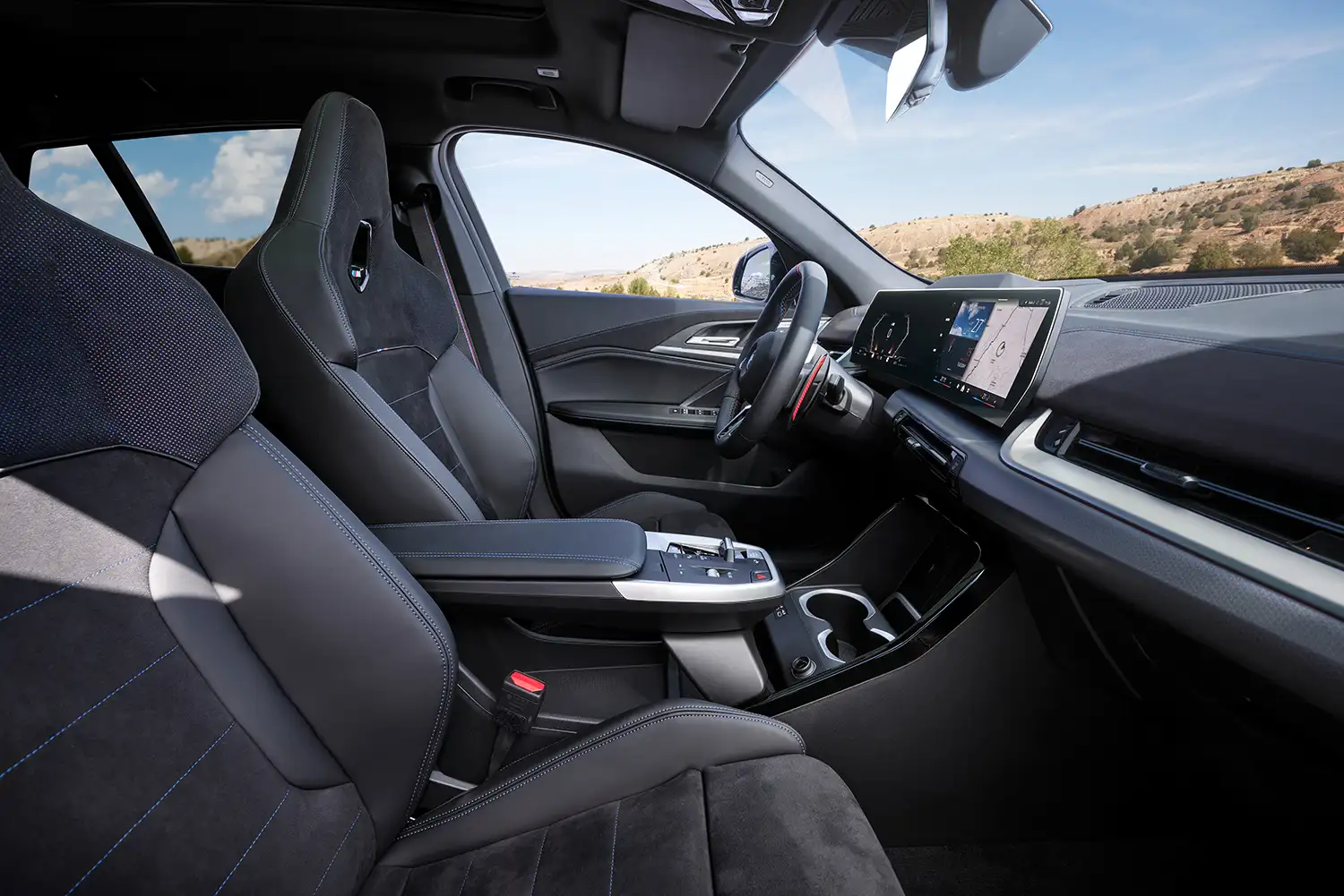 The interior of the new BMW X2 has a modern premium ambience with sporting touches. The slender instrument panel, housing the BMW Curved Display, is joined in the cabin by a “floating” armrest with integral control panel. In the front section of the centre console are two cup holders and a smartphone tray with indirect illumination and wireless charging.
