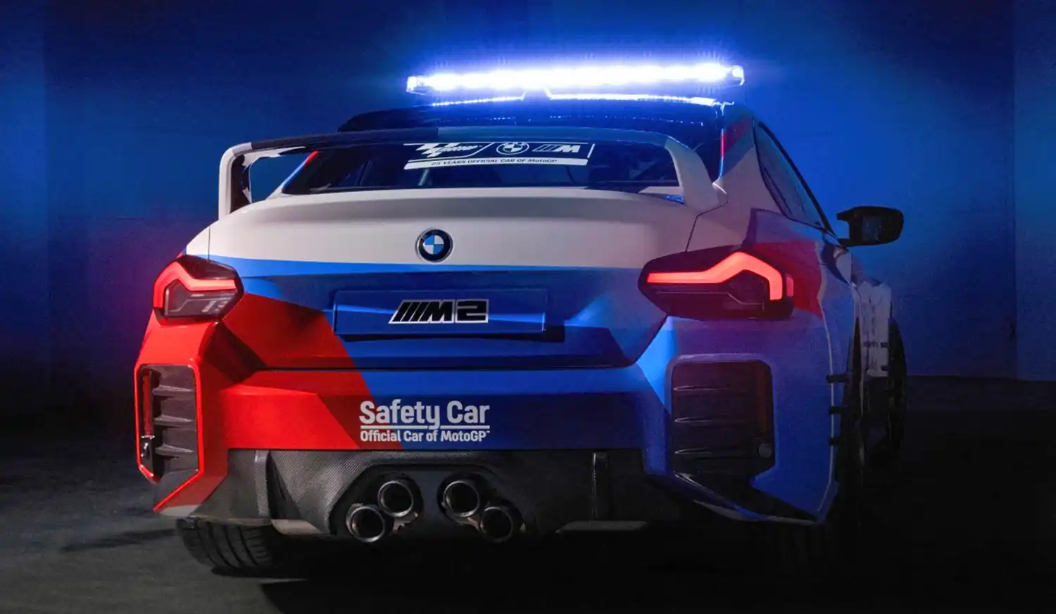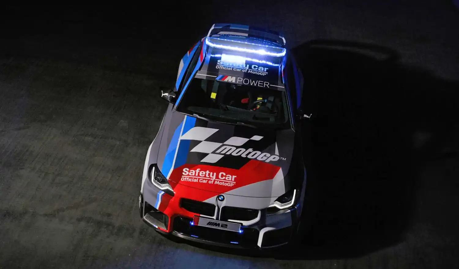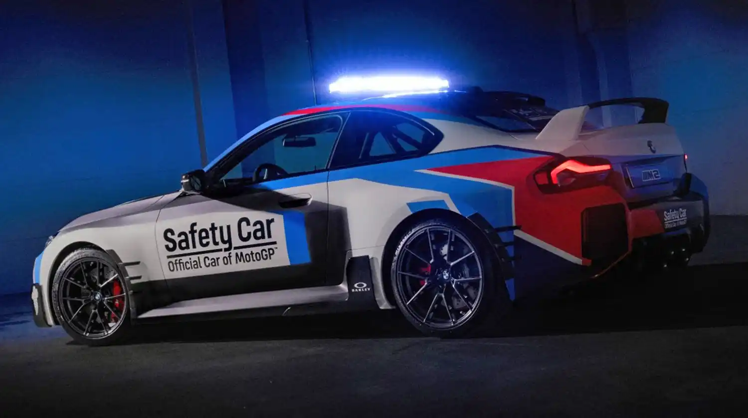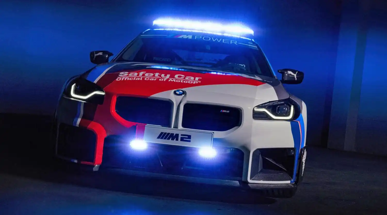 The new BMW M2 impresses with the traditional characteristics of a high-performance sports car – in a concentrated form and with state-of-the-art technology. With its compact dimensions and the 460 hp TwinPower turbo in-line 6-cylinder engine, the new BMW M2 is the perfect basis for a BMW M safety car. The BMW M2 was kitted out with various safety car elements for its deployment on MotoGP™ racetracks. These elements include a roll bar, RECARO seats, 6-point racing harness, a fire extinguisher, the safety car roof bar, and the matching front light. Several M Performance parts, such as exhaust system, chassis, carbon wing mirror covers, diffusor, and rear wing have also been installed. The BMW M2 MotoGP™ safety car will have the standard BMW M safety car livery. In addition to the new BMW M2 MotoGP™ safety car, the safety car fleet of 2023 also includes many other BMW M safety, medical and official cars, as well as BMW M 1000 RR safety bikes.