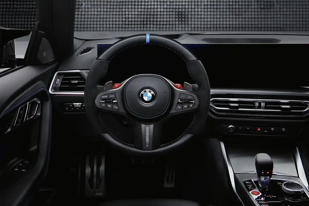 The M Performance steering wheel Pro is ideal for cornering with supreme precision. It features a distinctly contoured grip area in Alcantara with large thumb rests and a special lining, while the rim’s upper section and slightly flattened lower section are wrapped in top-quality fulled leather. A centre marker and decorative stitching in the BMW M GmbH colours put the finishing touches to the steering wheel’s stunning looks. The M Performance steering wheel trims offer another route to increased driving pleasure with their high-quality materials and racing-car feel. They are available for the new BMW M2 in a choice of carbon fibre/Alcantara and carbon fibre/leather. Both variants can also be combined with the M Performance shift paddles carbon fibre. The M Performance door sill plates carbon fibre provide the ideal transition between the dynamism of the new BMW M2 exterior and the sports car flair of its cabin. Their carbon fibre inlays are printed with a coloured M Performance logo.