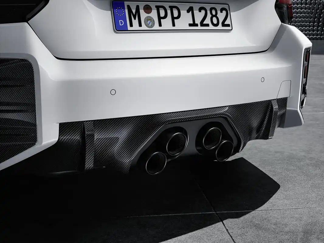 M Performance tailpipe trims in titanium/carbon fibre are available as an eye-catching addition to the standard exhaust system fitted on the new BMW M2. Their sophisticated mix of materials and perforated inner pipes lend the rear end a highly exclusive air.