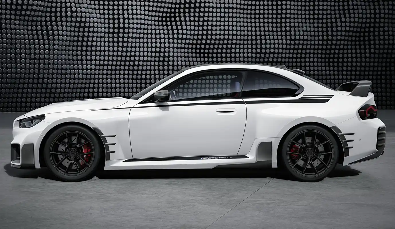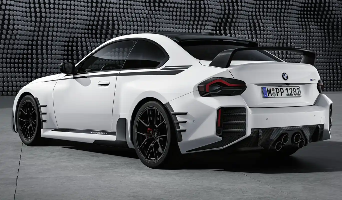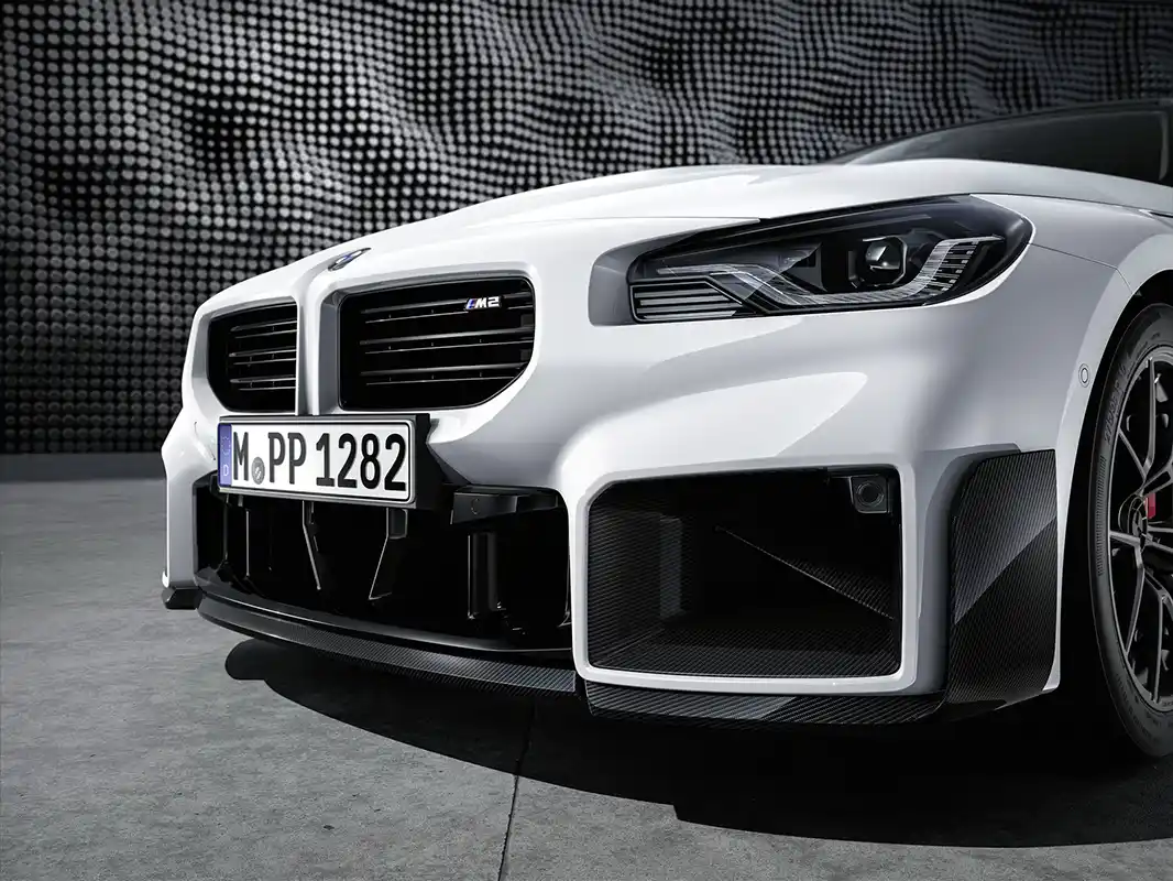 The new BMW M2 (fuel consumption combined: 9.8 – 9.6 l/100 km [28.8 – 29.4 mpg imp]; CO2 emissions combined: 222 – 218 g/km in the WLTP cycle; figures for the NEDC cycle: – ) promises unadulterated driving pleasure through every mile – of everyday journeys and track sessions alike. The race-inspired character of the compact high-performance sports car can be accentuated to stunning effect with the help of the BMW M Performance Parts specially developed for this model. Available from the launch of the new M2 (which gets underway in April 2023), the retrofit products from the Original BMW Accessories range add extra touches of rich emotionality to the design of the new BMW M2.