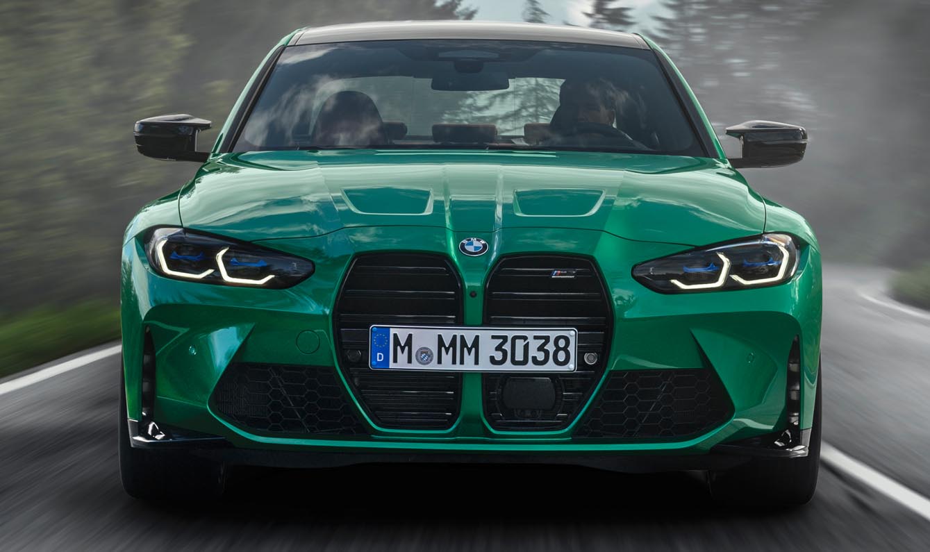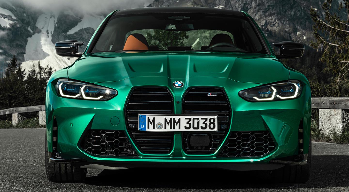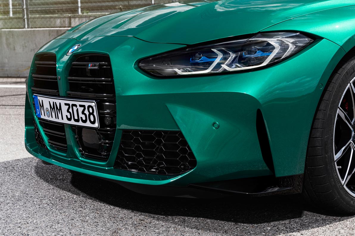 The BMW M models cut a distinctive and immediately recognisable figure from any angle. The front-end design of the new BMW M3 Sedan displays a particularly high degree of differentiation. Like the new BMW M4 Coupé, it has a large, vertically arranged and extremely deep BMW kidney grille – a visually powerful reference to the significant cooling air requirement of the engine behind the scenes. The BMW kidney grille is frameless and all-black. On both models, the hallmark M double bars – now horizontally arranged – bear a model badge. Optimised cooling for the engine and brakes is provided by large additional intakes on either side of the kidney grille. These two-section apertures – brake air ducts on the inside, air supply for the remote coolant radiators to the outside – have honeycomb mesh covers as standard. At the outer edges of the front apron, the vertical intakes for the Air Curtains with integrated, aerodynamically effective “flics” accentuate the width of the car.