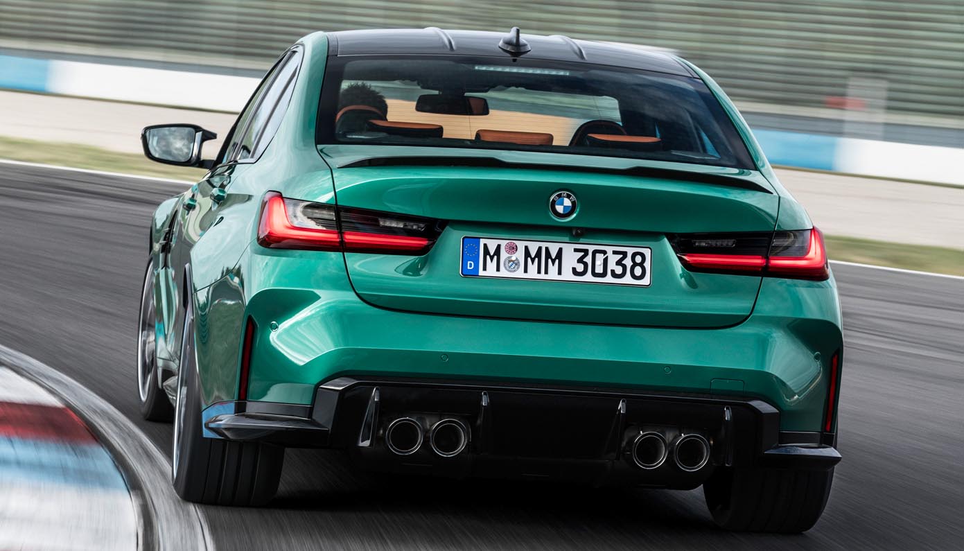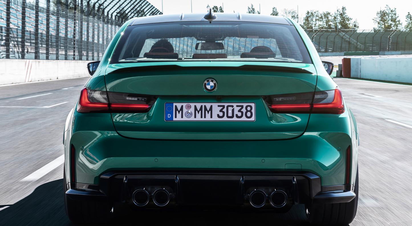 The roof of both the new BMW M3 Sedan and new BMW M4 Coupé is made from carbon-fibre-reinforced plastic (CFRP). The use of this extremely lightweight high-tech material lowers the cars’ centre of gravity, enhancing their agility. Two fins running longitudinally over the CFRP roof optimise airflow, as does the rear spoiler, which is painted in body colour – or High-gloss Black on the Competition models – and has a central notch. The rear diffuser comes in black on all model variants and frames the exhaust system’s characteristic pairs of tailpipes (each measuring 100 millimetres in diameter). The tailpipes come in Black Chrome as standard on the Competition models and can be ordered in this specification as an option on the other variants. The diffuser’s eye-catching fins extend the lines of the airflow-guiding elements on the roof, and a surround in High-gloss Black is connected to the rear apron attachment part, rounding off the powerful aura. The slim, stylishly darkened rear light clusters with L-shaped taillights extend well into the flanks, further accentuating the width of the two high-performance sports cars. All of the light functions use LEDs as standard. The contour of the vertically arranged reflectors at the outer edge of the rear apron mimics the appearance of the Air Curtains at the front end.