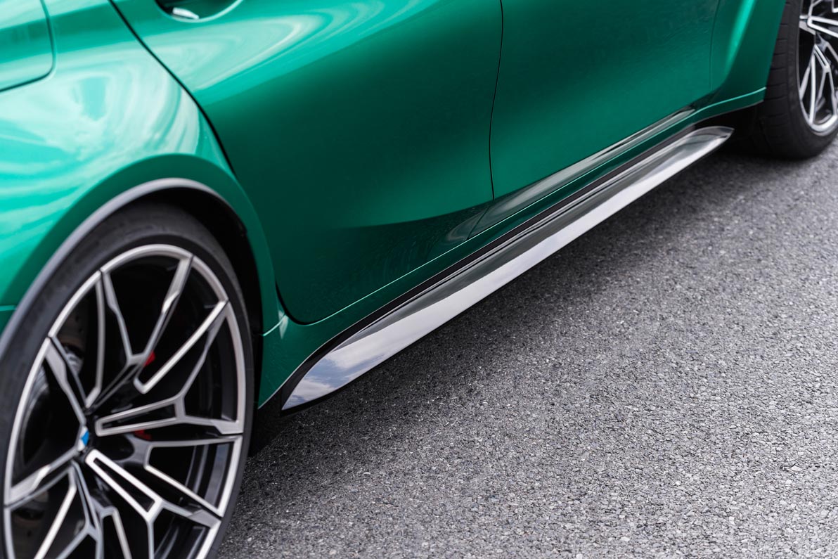 As in the powerfully moulded flanks of the new BMW M3 Sedan, a small number of lines give the elegant silhouette of the new BMW M4 Coupé its structure and link up with signature M details. The most striking design feature alongside the prominently flared wheel arches are the extended side sills. Together with the attachment parts for the front and rear aprons, which also jut out significantly, they form a High-gloss Black band around the whole of the car. This racing car-inspired body element also adopted on the first-generation BMW M3 increases downforce in the underbody area, complementing the array of details designed to optimise aerodynamic balance – including the front spoiler lip, aero flics for the Air Curtains and brace covers – to compelling effect. The prominent side skirts visually reinforce the impression of a light, low-to-the-road machine.
