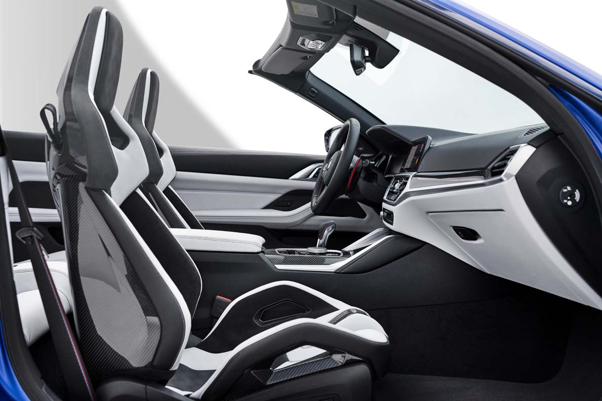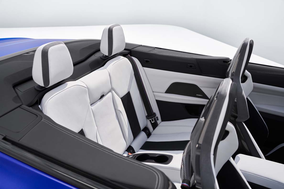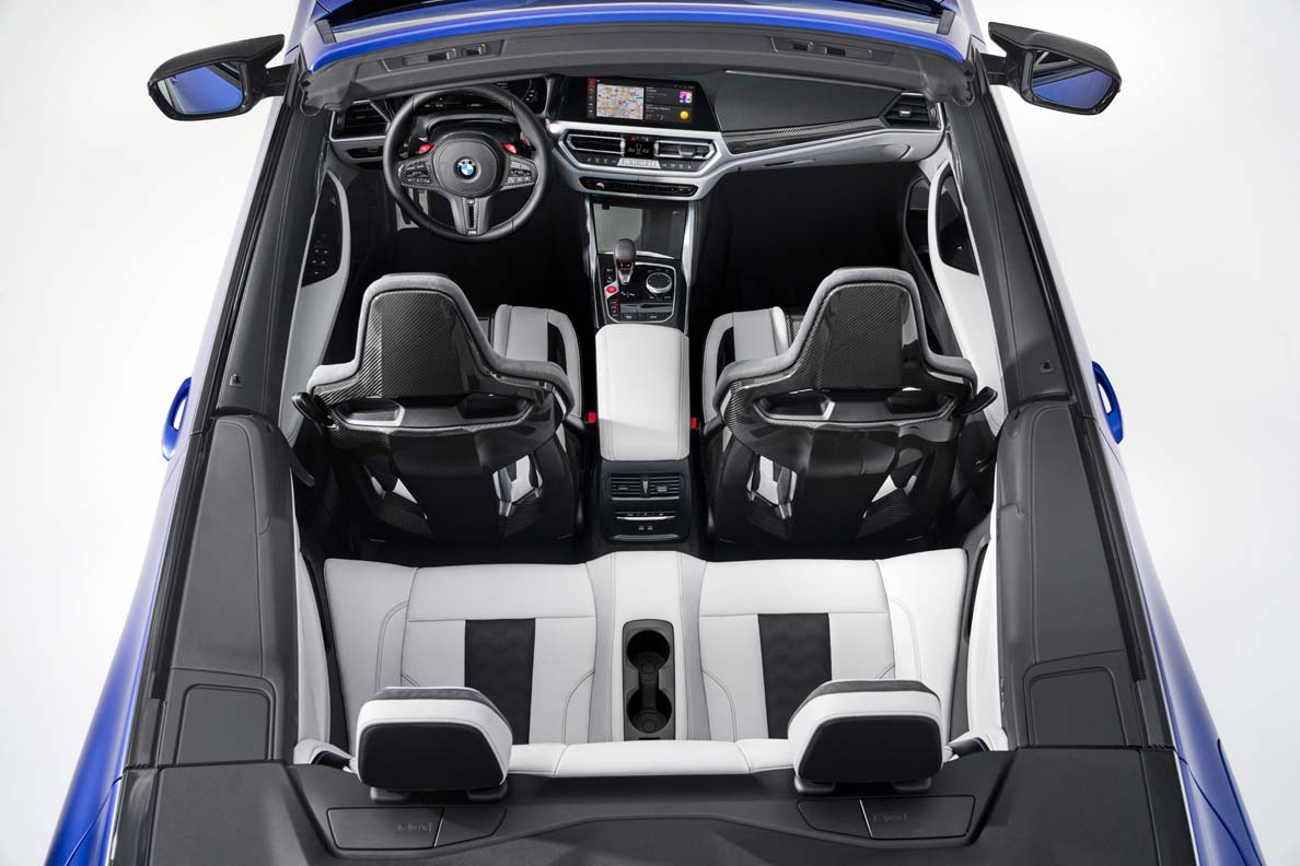 Added to which, the new BMW M 4 Competition Convertible with M xDrive comes as standard with heated M Sport seats with boldly contoured side bolsters, height-adjustable integral head restraints, an illuminated “M4” logo and Extended Merino leather trim available – like the optional Merino full leather trim – in four colour variants. The options list also contains four BMW Individual Extended Merino leather trim variants and four BMW Individual Merino full leather trim options. The standard-fitted M Sport seats can be specified as an option with neck warmers and seat ventilation. Meanwhile, the optional heated M Carbon bucket seats, likewise with full electric adjustment, provide an optimised connection between driver and car reminiscent of that in a racing car.