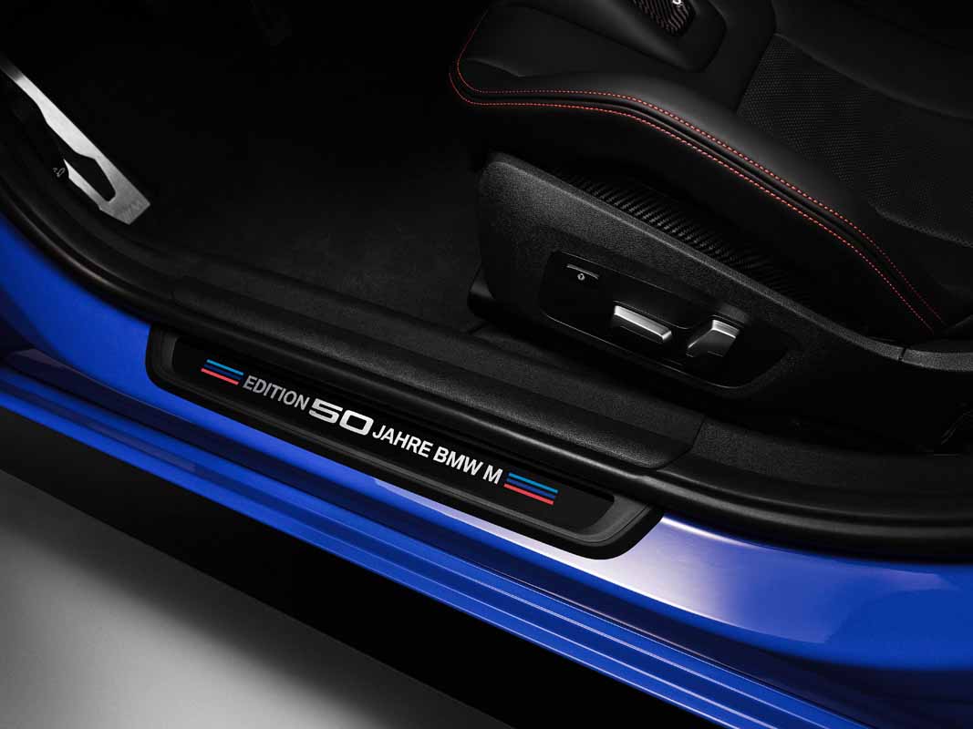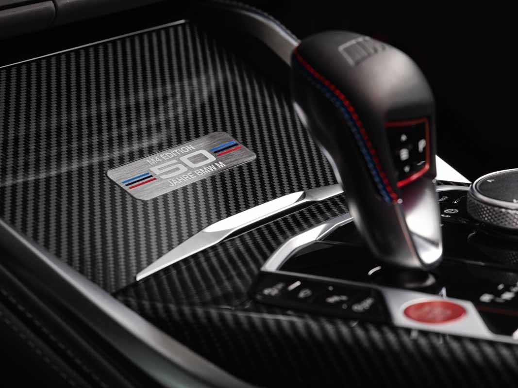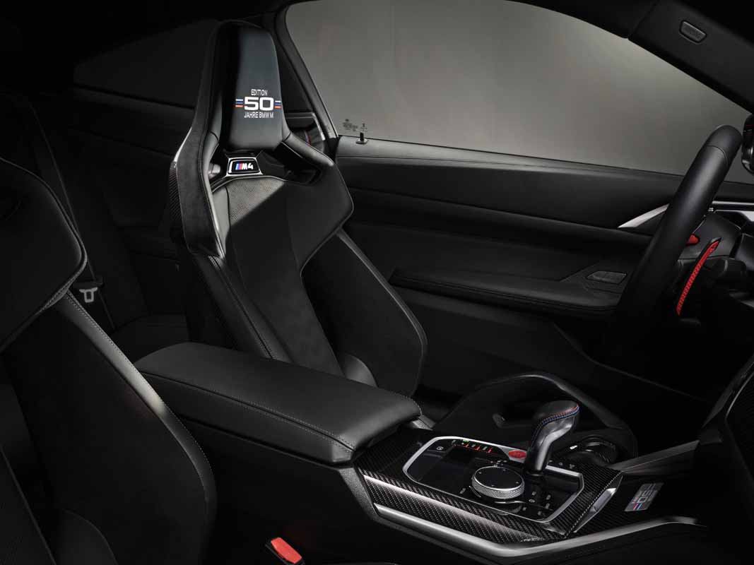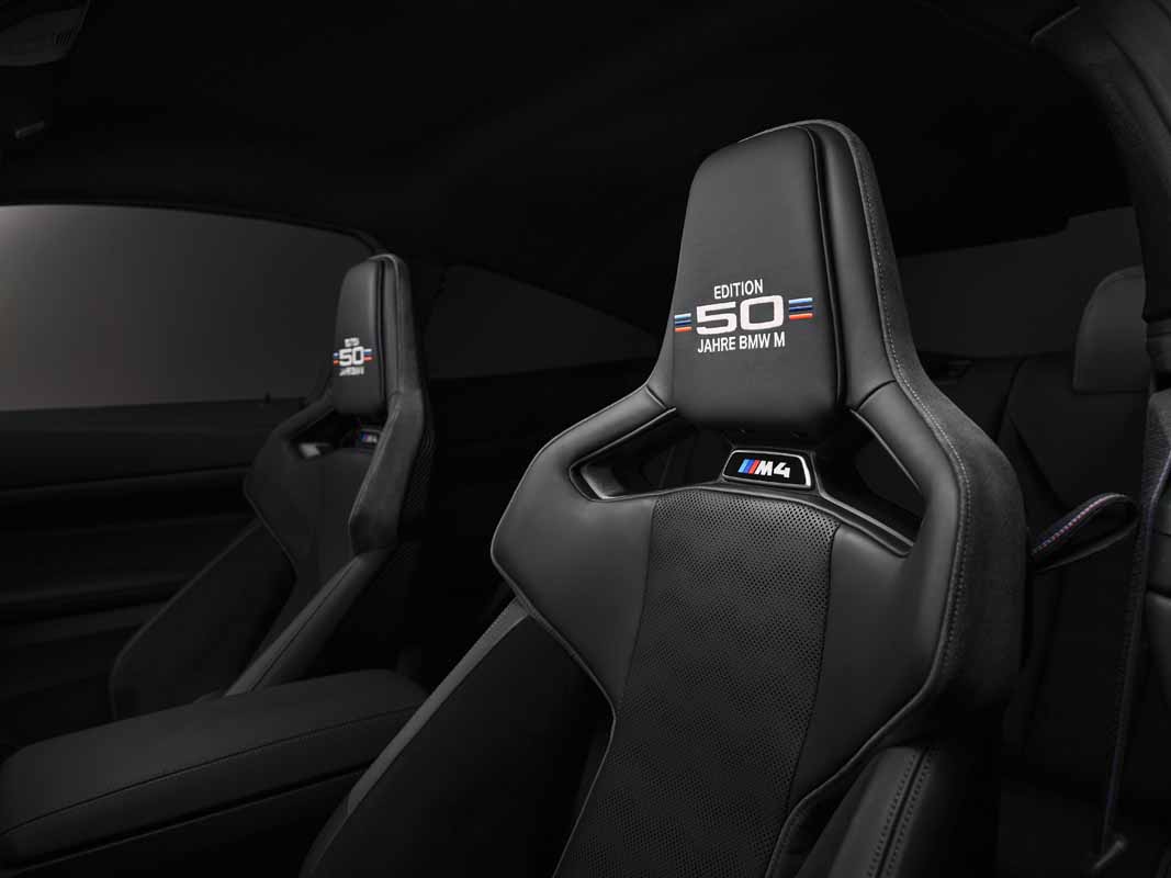In the interior of all edition vehicles based on the BMW M4 Coupe, door sill panels bearing the lettering “Edition 50 Jahre BMW M”, a metal plaque on the centre console with the lettering “M4 Edition 50 Jahre BMW M” and a corresponding imprint on the headrests of the standard M sports seats and the optional M carbon bucket seats for driver and front passenger hint at the anniversary.
