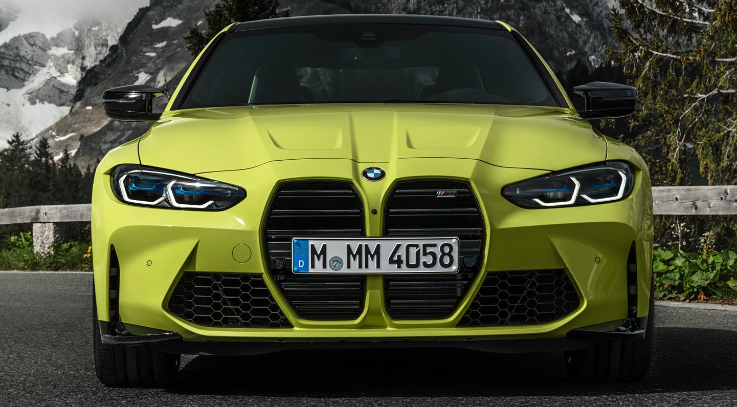 The BMW M models cut a distinctive and immediately recognisable figure from any angle. The front-end design of the new BMW M3 Sedan displays a particularly high degree of differentiation. Like the new BMW M4 Coupé, it has a large, vertically arranged and extremely deep BMW kidney grille – a visually powerful reference to the significant cooling air requirement of the engine behind the scenes. The BMW kidney grille is frameless and all-black. On both models, the hallmark M double bars – now horizontally arranged – bear a model badge. Optimised cooling for the engine and brakes is provided by large additional intakes on either side of the kidney grille. These two-section apertures – brake air ducts on the inside, air supply for the remote coolant radiators to the outside – have honeycomb mesh covers as standard. At the outer edges of the front apron, the vertical intakes for the Air Curtains with integrated, aerodynamically effective “flics” accentuate the width of the car.