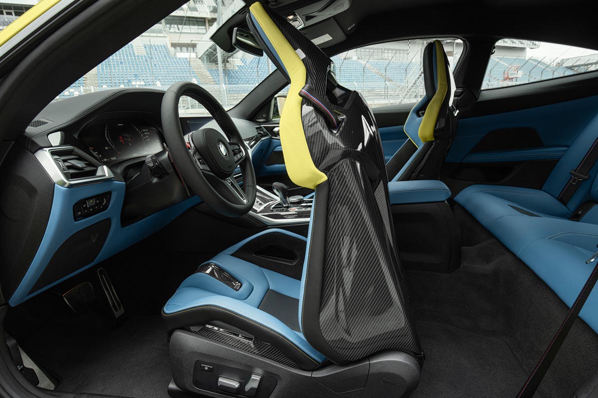 The M Race Track Package – offered for the first time for the new BMW M3 Sedan and new BMW M4 Coupé – brings about a targeted reduction in vehicle weight. This package includes M Carbon ceramic brakes, weight-minimised M light-alloy wheels (available as an option with semi-slick tyres), M Carbon bucket seats for the driver and front passenger, and interior trim strips in Carbon Fibre High-gloss.