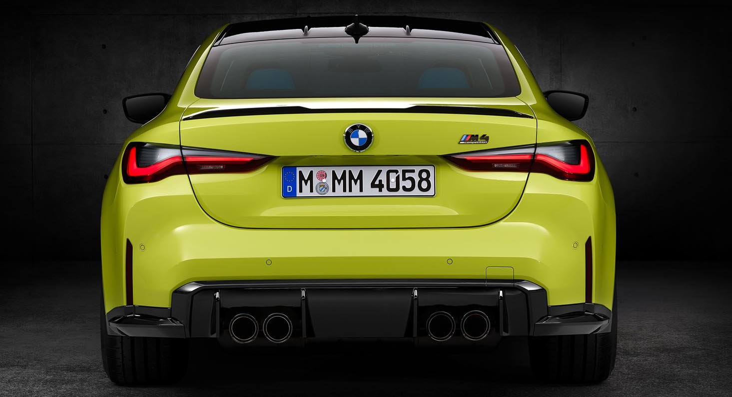 The roof of both the new BMW M3 Sedan and new BMW M4 Coupé is made from carbon-fibre-reinforced plastic (CFRP). The use of this extremely lightweight high-tech material lowers the cars’ centre of gravity, enhancing their agility. Two fins running longitudinally over the CFRP roof optimise airflow, as does the rear spoiler, which is painted in body colour – or High-gloss Black on the Competition models – and has a central notch. The rear diffuser comes in black on all model variants and frames the exhaust system’s characteristic pairs of tailpipes (each measuring 100 millimetres in diameter). The tailpipes come in Black Chrome as standard on the Competition models and can be ordered in this specification as an option on the other variants. The diffuser’s eye-catching fins extend the lines of the airflow-guiding elements on the roof, and a surround in High-gloss Black is connected to the rear apron attachment part, rounding off the powerful aura. The slim, stylishly darkened rear light clusters with L-shaped taillights extend well into the flanks, further accentuating the width of the two high-performance sports cars. All of the light functions use LEDs as standard. The contour of the vertically arranged reflectors at the outer edge of the rear apron mimics the appearance of the Air Curtains at the front end.