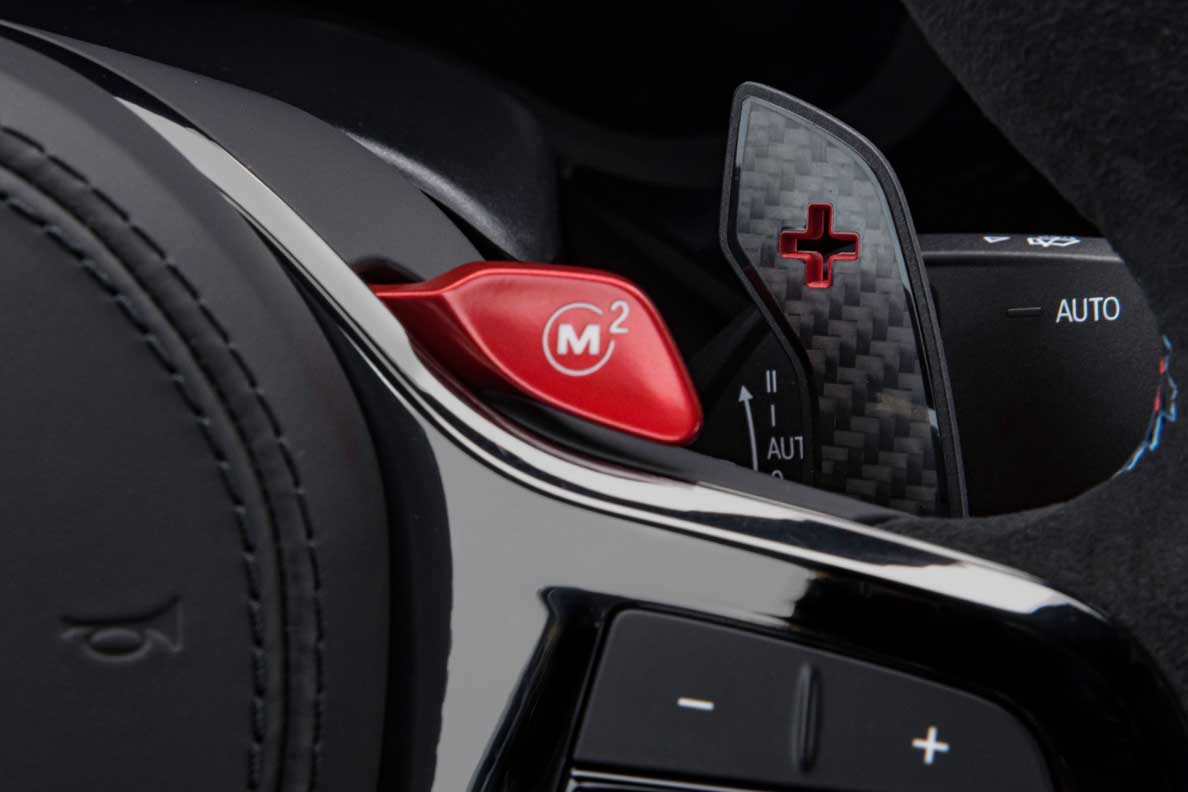 The M Alcantara steering wheel’s 12 o’clock centre-marker perforation with red background is a classic race car influence, while the shift paddles are made of carbon. “The steering wheel feels very good, and the shift paddles and carbon seats make the driving experience at the racetrack a real delight,” said De Phillippi.