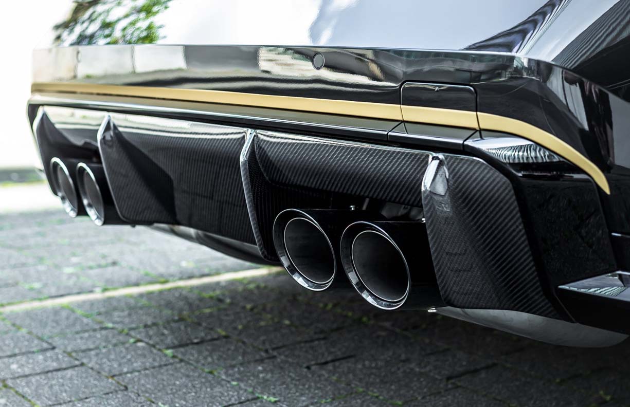 Parallel to the electronic tuning, They installed an in-house produced, stainless steel rear silencer with valve control function, which trumpets strikingly from its four 100-millimetre tailpipes, and can be either carbon or ceramic-coated. Optionally available are MANHART Race downpipes, without catalytic converters as well as MANHART OPF-Delete replacement pipes, with 200-cell HJS catalytic converters – both, however, without TÜV approval and thus only for export. An OPF Deleter solution is available as well for those who would like to remove their OPF/GPF filters fitted in the stock exhaust.