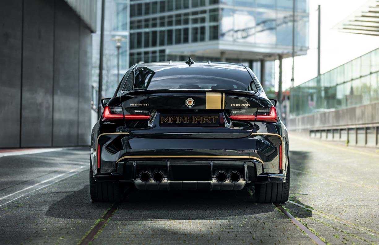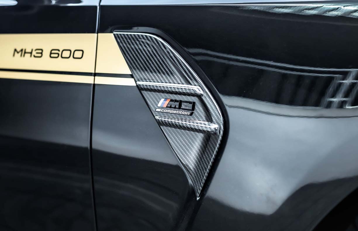 Visually, the MH3 600 is of course presented in the traditional MANHART design with gold accents on a gloss black background. The factory (optional) carbon outfit, consisting of a front spoiler, a rear spoiler, side skirts and aero flicks from the M Performance range, has been extended by us with an in-house carbon rear diffuser, which perfectly frames the twin tailpipes of the exhaust system.