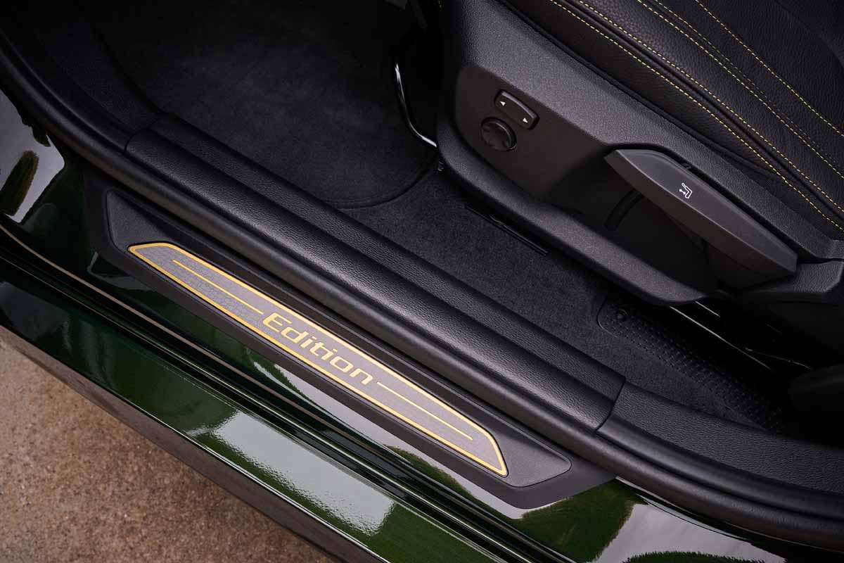 M-specific equipment features combine with innovative details to create a sporty and exclusive ambience inside the BMW X2 Edition GoldPlay. The M leather steering wheel with multifunction buttons, anthracite-coloured headliner, M stainless steel pedals, M driver’s footrest and car key with distinctive M identifier underscore the sporting instincts of the special edition. Judiciously placed accents create a stylistic connection with the exterior design. These include door sill strips which have a surface structure derived from the BMW kidney grille’s mesh design and bear “Edition” lettering in Galvanic Gold. Around the instrument panel on the front passenger side of the cabin, the Dark Graphite matt trim strips – likewise a bespoke design for the GoldPlay Edition – display a graphic referencing the exterior foliation. For the first time, a laser engraving technique is used, which applies the graphic in the colour Golden Mica metallic on the surface of the strip and seals it with clear varnish.