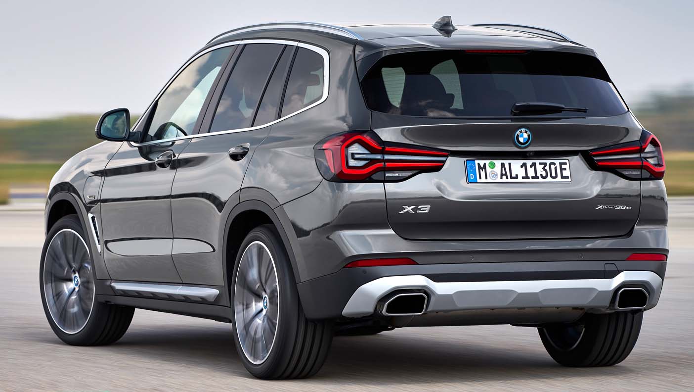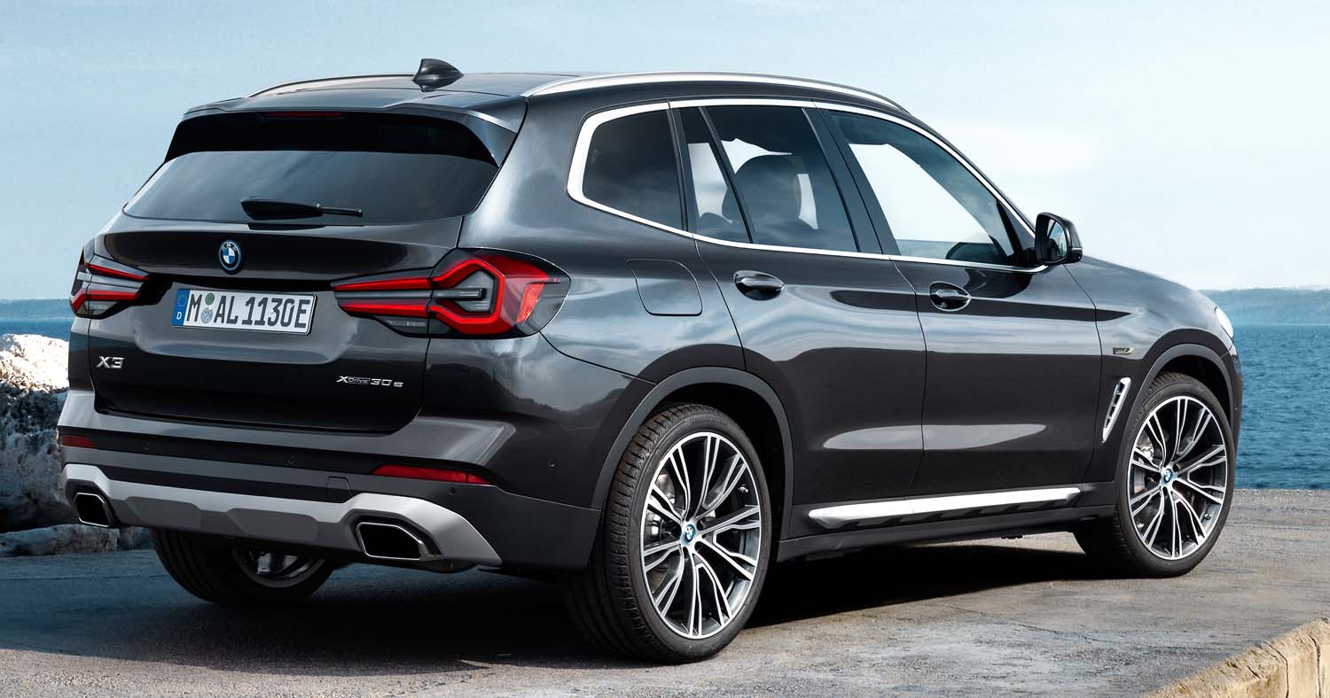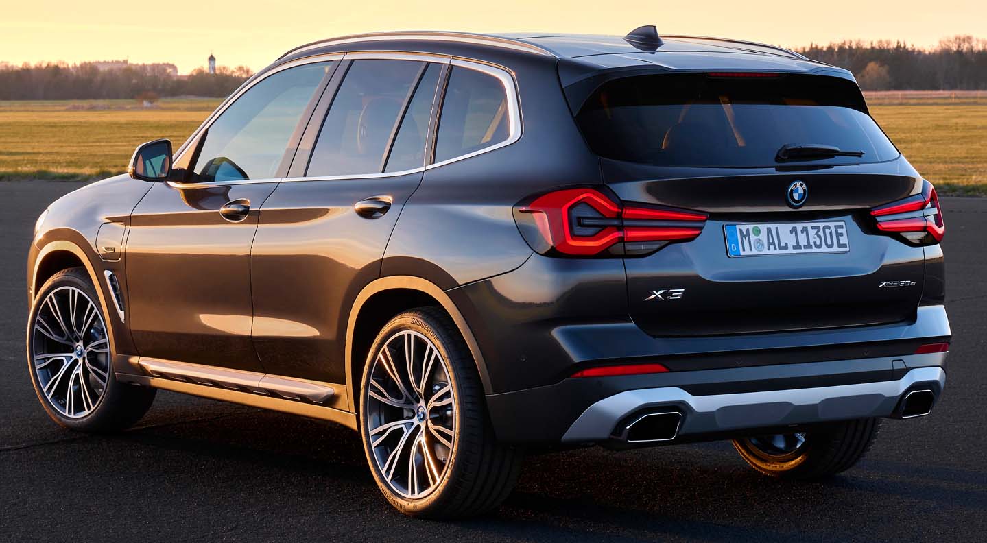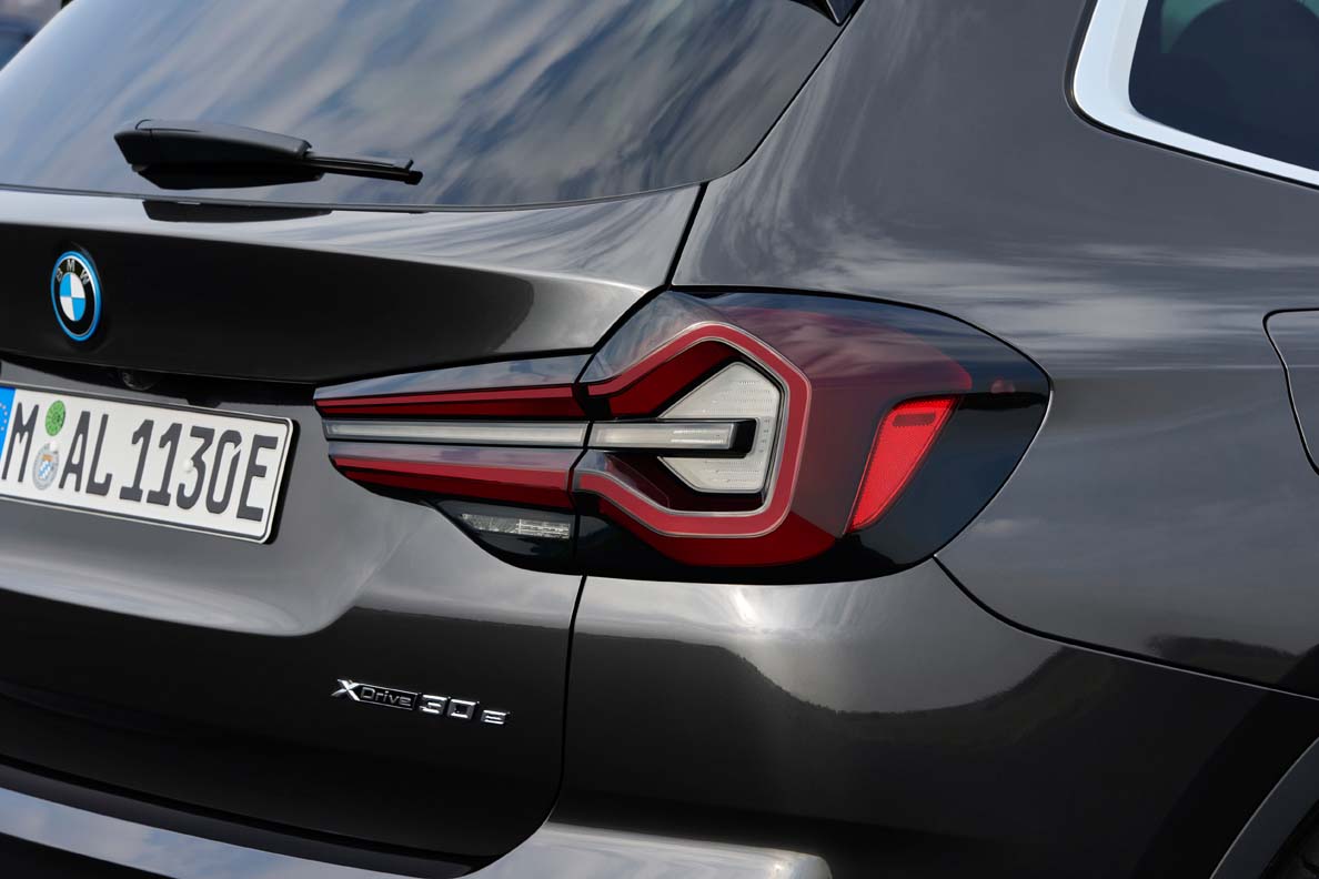 Below the headlights, vertical air intakes arranged in a triangular interpretation frame the front bumper. In the new front apron, taut and amply-sized surfaces in body colour and the robust underbody protection reinforce the presence and high-quality aura of the SAV. The BMW X3 xDrive30e with plug-in hybrid drive also bears an “electrified by i” emblem on the front wing, while an additional blue ring adorns all BMW logos on this engine version, including those on the wheel hub covers. The rear section of the new BMW X3 offers greater clarity as a result of various measures. A black border gives the full LED rear lights a more precise appearance, while the narrower light graphic now includes a three-dimensionally modelled pincer contour and horizontal turn signals integrated in filigree style. The emphasis on horizontal lines, for example in the concave area at the lower end of the tailgate, contributes to the tidy impression of the rear. The newly designed and elaborately painted underbody protection provides a powerful finish to the road. The new, flush-fitting free-form tailpipe trims are larger and sportier, conveying a more powerful presence.