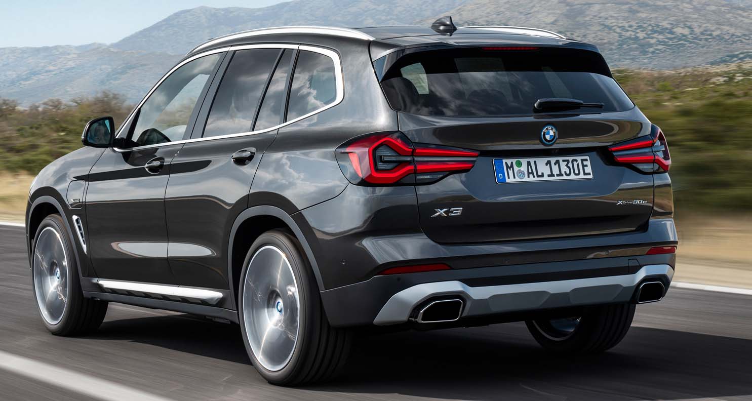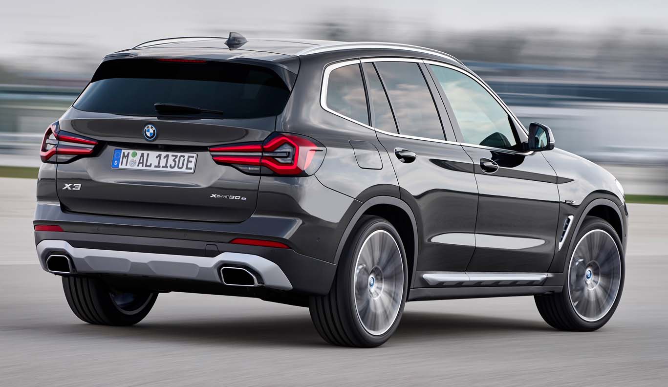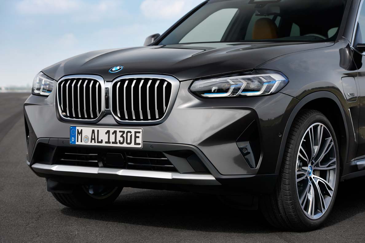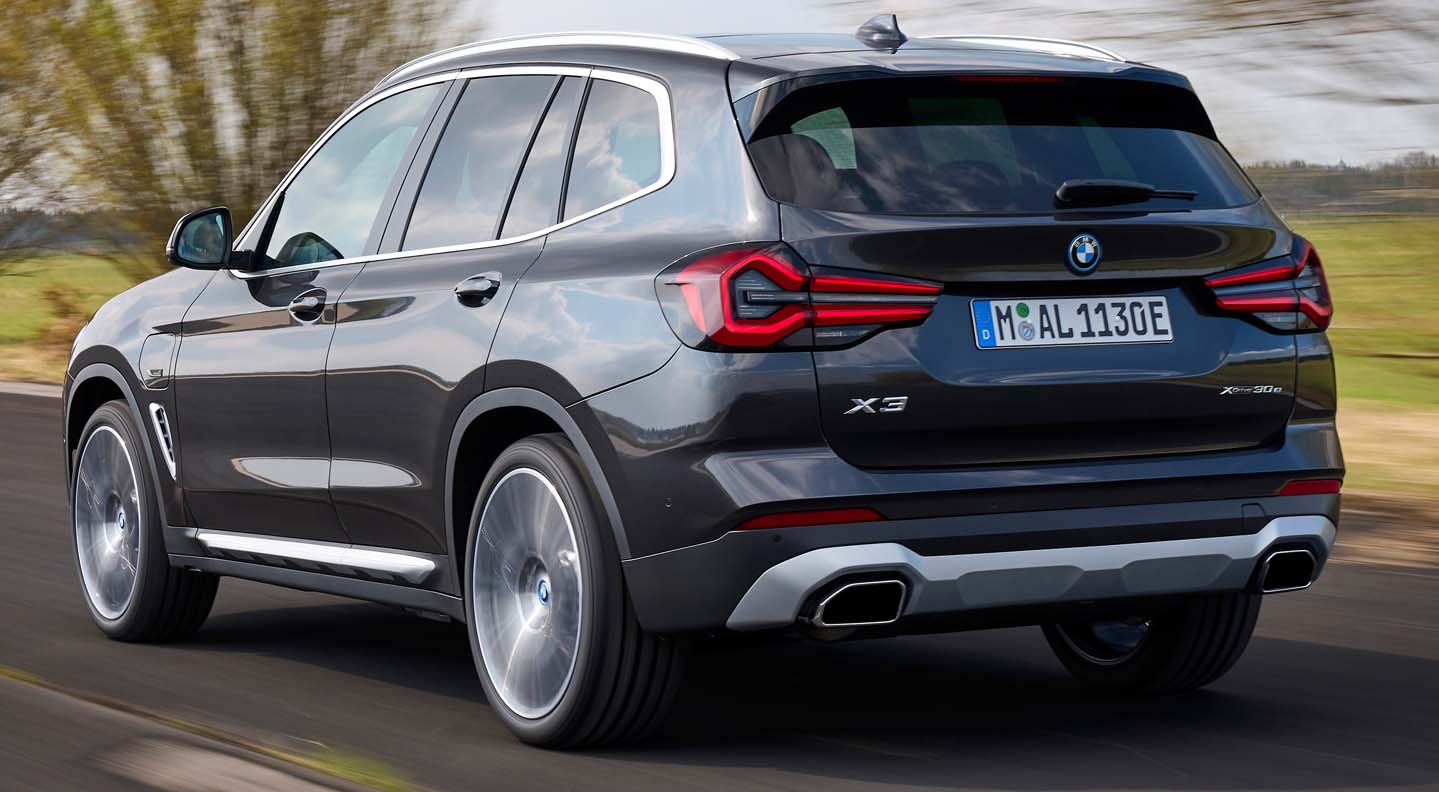 Below the headlights, vertical air intakes arranged in a triangular interpretation frame the front bumper. In the new front apron, taut and amply-sized surfaces in body colour and the robust underbody protection reinforce the presence and high-quality aura of the SAV. The BMW X3 xDrive30e with plug-in hybrid drive also bears an “electrified by i” emblem on the front wing, while an additional blue ring adorns all BMW logos on this engine version, including those on the wheel hub covers. The rear section of the new BMW X3 offers greater clarity as a result of various measures. A black border gives the full LED rear lights a more precise appearance, while the narrower light graphic now includes a three-dimensionally modelled pincer contour and horizontal turn signals integrated in filigree style. The emphasis on horizontal lines, for example in the concave area at the lower end of the tailgate, contributes to the tidy impression of the rear. The newly designed and elaborately painted underbody protection provides a powerful finish to the road. The new, flush-fitting free-form tailpipe trims are larger and sportier, conveying a more powerful presence.